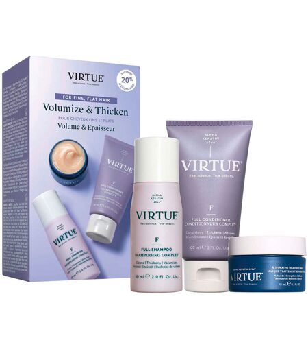 Mehr Volumen für feines, kraftloses Haar für maximale Beweglichkeit und Sprungkraft. Das Virtue Full Discovery Kit beinhaltet: 1 x Virtue Full Shampoo, 60 ml1 x Virtue Full Conditioner, 60 ml1 x Virtue Restorative Treatment Mask, 15 ml Virtue Full Shampoo: Mehr Volumen für feines, kraftloses Haar für maximale Beweglichkeit und Sprungkraft. Virtue® Full Shampoo reinigt und verleiht Ihrem Haar gleichzeitig mehr Volumen. Es löst überschüssiges Öl, lockert die Haarwurzeln und verleiht jeder einzelnen Strähne Volumen, für schwerelose, lang anhaltende Fülle. Anwendung: Eine Portion Shampoo in der Größe eines Fünfzig-Cent-Stücks zwischen den Handflächen aufschäumen. Auf das nasse Haar auftragen, zu einem reichen Schaum aufschäumen, einmassieren und ausspülen. Danach Full Conditioner anwenden, gründlich ausspülen. Virtue Full Conditioner: Virtue® Full Conditioner macht das Haar mit jeder Anwendung dicker, ohne es zu beschweren. Er spendet dem Haar tiefgehende Feuchtigkeit und schafft damit lang anhaltenden Schwung, Fülle und Glanz. Anwendung: Eine großzügige Menge Conditioner auf die Handflächen geben und von den Haarspitzen aus nach oben zu den Wurzeln in die Haare einmassieren. Conditioner mit einem grobzinkigen Kamm im Haar verteilen. 2-3 Minuten im Haar belassen. Die Haare gründlich ausspülen. Virtue Restorative Treatment Mask: Die Kehrtwende für Ihre beschädigten Haare! Mit dieser extrem pflegenden, ausgezeichnet stärkenden Maske zur Pflege aller Haartypen kann in 3 Minuten die Gesundheit Ihrer Haare verbessert werden. Virtue® Restorative Treatment Mask stellt Haare, die zusätzliche Pflege brauchen, mit einer Soforthilfe an Glanz, Feuchtigkeit und Widerstandkraft wieder her, ohne sie zu beschweren. Anwendung: Nach dem Waschen überschüssiges Wasser ausdrücken, eine großzügige Menge des Produkts auftragen und gleichmäßig im Haar verteilen. 2-3 Minuten im Haar belassen. Gut ausspülen. Das Produkt wöchentlich oder nach Bedarf verwenden. ...