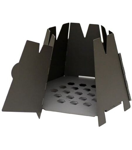 Darüber hinaus lässt sich der Vargo Hexagon Edelstahl Holzofen auch mit Trockenbrennstoff-Tabletten (z.B. Esbit) betreiben. Er ist komplett aus stabilem, langlebigem Edelstahl hergestellt und kommt flach zusammengelegt in einem robusten Transportbeutel. Mit seinem genialen Klappmechanismus ist er im Nu aufgestellt. Mit wenigen Handgriffen entsteht so eine 5-eckige Pyramide mit einer Türe und einer Stellfläche für Töpfe bis ca. 1,5 Liter Volumen. Die konische Form des Ofens sorgt für einen guten Zug, über die Türe kann auch mit aufgestelltem Topf Brennmaterial nachgelegt und die Luftzufuhr reguliert werden. Bei optimalen Bedingungen kriegt man im Hexagon das Wasser für die Suppe (1 Liter) schon in 5 - 7 Minuten zum Kochen. !!! Die Unterseite wird heiß, daher nur auf feuerfestem Untergrund benutzen !!! ...