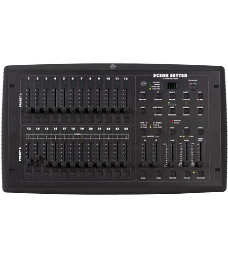 American DJ Scene Setter 24: Der Scenesetter24 ist eines der meistverkauften Lichsteuerpulte weltweit. Mit ihm lassen sich im Handumdrehen bis zu 24 einzelne DMX Dimmerkanäle steuern. 48 Shows lassen sich aus bis zu 4200 Szenen erstellen und abspeichern. Flash Tasten ermöglichen eine komfortable Live-Steuerung und die zusätzlichen Flash und Blackout Tasten sowie die Überblendsteuerung vervollständigen das Gerät.Merkmale: : konventionelles DMX Dimmerpult, 24 unabhängige DMX Kanäle, 4200 frei programmierbare Szenen, Passwortschutz für Szenen (ideal für den Verleihbetrieb), 48 frei programmierbare, ebenfalls passwortgeschützte Programme, Einzellauflichter oder Mix-Funktion, Blind & Dark Funktion. Blindprogrammieren, 24 Einzelkanalfader, 24 Flash Tasten (je Kanal eine), A/B Master Fader. Überblendung von einer Einstellung zur anderen, TAP Taster um die Geschwindigkeit der Programme zu steuern, Unabhängige Geschwindigkeits- und Überblendregelung, FULL-ON Taster für 100% Output auf allen 24 Kanälen (Flashen), helles LCD Display, kompatibel zu allen DMX 512 Dimmern , Sound-to-Light Steuerung über eingebautes Mikrofon oder auf der Rückseite angebrachten Cinch-Audioeingang, Einstellen der Musikempfindlichkeit, Auslösetaster für Nebelmaschinen mit Statusanzeige (Heizen/Bereit), DMX Polaritätsumschaltung (2-, 3+/2+, 3-), Midi-Ein- & Ausgang für die Ansteuerung durch Keyboards oder Miditastaturen, externes 12-20V DC Netzteil im Lieferumfang (min 500mA), 19" Rackgehäuse zum Einbau in Cases und Konsolen, mitgelieferte, abnehmbare Kunststoffkanten für die Verwendung als Tischgerät ohne Case, Abmessungen: 267 x 483 x 76mm, Gewicht: 5kg ...