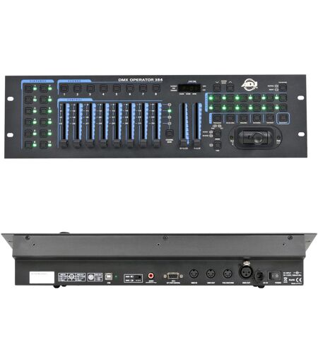 American DJ DMX Operator 384: Der DMX Operator 384 ist ein 19-Zoll-Rack-Controller, der sowohl DMX als auch Midi steuert. Es steuert bis zu 384 DMX-Kanäle und verfügt über 30 programmierbare Szenenbänke (insgesamt 240 programmierbare Szenen), 12 programmierbare Chases und einen zuweisbaren Joystick.Spezifikationen: 2 Controller in 1 (DMX- und Midi-Controller), 12 Geräte - 32 DMX-Kanäle, 384 Kanäle insgesamt, 30 programmierbare Szenenbanken - 240 programmierbare Szenen, 12 programmierbare Chases, 8 Steuerfader x 4 Kanalbänke, Zuweisbarer Joystick, Speed und Fade Fader, Eingebautes Mikrofon oder Line-Level-Cinch-Audio-Eingang für Musik-Trigger, MIDI-Eingang für Szenen-, Chase- oder Blackout-Trigger, Tippen Sie auf die Synchronisierungsschaltfläche, um die Geschwindigkeit der Verfolgung zu erhöhen, Nebelmaschine Eingang und Trigger-Taste (Für die Verwendung mit bestimmten ADJ Foggers), RS-232-Eingang, Blackout-Taste ...