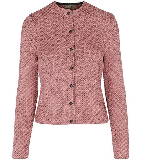 Modische Damen Trachten Strickjacke mit Waffelmuster Rundhalsausschnitt Langarm Silberfarbene Knöpfe Feinste italienische Merinowolle Weiche, Cashmereartige Haptik mit geringem Antipilling Hergestellt in Deutschland Schmale Passform Unifarben Farbbezeichnung: Nelkenrosa Material: 100% Merino extrafein ...