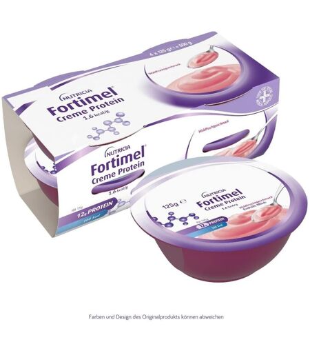Bitte achten Sie auf eine abwechslungsreiche und ausgewogene Ernährung und gesunde Lebensweise. Nutricia Fortimel Creme Protein Waldfruchtgeschmack Fortimel Creme Protein Waldfrucht ist eine hochkalorische, eiweißreiche Trinknahrung zum Löffeln mit Waldfruchtgeschmack. Sie wurde speziell für Patienten mit erhöhtem Energie- und Proteinbedarf entwickelt und eignet sich besonders für Personen mit Schluckstörungen oder Appetitlosigkeit. Die cremige Konsistenz ermöglicht eine angenehme Einnahme. Zutaten: Wasser, Kuhmilchproteine, Zucker, Glukosesirup, pflanzliche Öle (Rapsöl, Sonnenblumenöl), modifizierte Stärke, Kaliumcitrat, Emulgator (Mono- und Diglyceride von Speisefettsäuren), Dikaliumphosphat, Aroma, Cholinchlorid, Farbstoffe (Echtes Karmin, Ammoniak-Zuckerkulör), Säureregulator (Citronensäure), Stabilisator (Carrageen), Magnesiumhydroxid, Natrium-L-ascorbat, Maltodextrin, Natriumchlorid, Kaliumhydroxid, Eisenlaktat, Natriumhydroxid, Zinksulfat, Kupfergluconat, Nicotinamid, DL-α-Tocopherylacetat, Calcium-D-Pantothenat, Cholecalciferol, Thiaminhydrochlorid, Mangansulfat, Pyridoxinhydrochlorid, Natriumfluorid, Riboflavin, Retinylacetat, Cyanocobalamin, Pteroylmonoglutaminsäure, Chromchlorid, Kaliumiodid, Natriummolybdat, Natriumselenit, D-Biotin, Phytomenadion. Nährwertangaben: Nährwertangaben Nährwert Menge Pro Energie200 kcalPro 125 g Eiweiß12 gPro 125 g Fett7 gPro 125 g davon gesättigte Fettsäuren0,9 gPro 125 g Kohlenhydrate25 gPro 125 g davon Zucker12,5 gPro 125 g Ballaststoffe<0,5 gPro 125 g Salz0,4 gPro 125 g Verzehrempfehlung: Zur ergänzenden Ernährung: 1–3 Becher pro Tag. Zur ausschließlichen Ernährung: 8–10 Becher pro Tag oder nach ärztlicher Empfehlung. Hinweise & Aufbewahrung: Nur unter ärztlicher Aufsicht verwenden. Nicht geeignet für Kinder unter 3 Jahren. Bei Kindern ab 3 Jahren nur unter besonderer Vorsicht und ärztlicher Kontrolle verwenden. Vor dem Öffnen bei Raumtemperatur lagern. Nach dem Öffnen im Kühlschrank aufbewahren und innerhalb von 24 Stunden verbrauchen. Nettofüllmenge: 4 x 125 g = 500 g Hersteller: Danone Deutschland GmbH Am Hauptbahnhof 18 60329 Frankfurt am Main ...