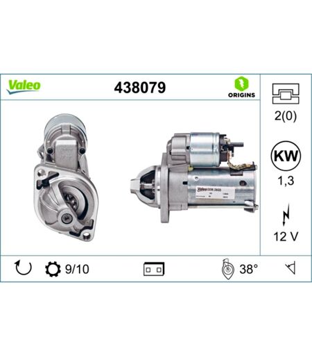 Drehrichtung: Drehrichtung im Uhrzeigersinn. Flansch-ø [mm]: 70. Gewicht [kg]: 2,91. Hersteller: VALEO. Herstellernummer: 438079. Index: VAL438079. Klemme: NO. Lage/grad: L 38. Lochanzahl: 2. Spannung [V]: 12. Starterleistung [kw]: 1,3. Zähnezahl: 9. ...