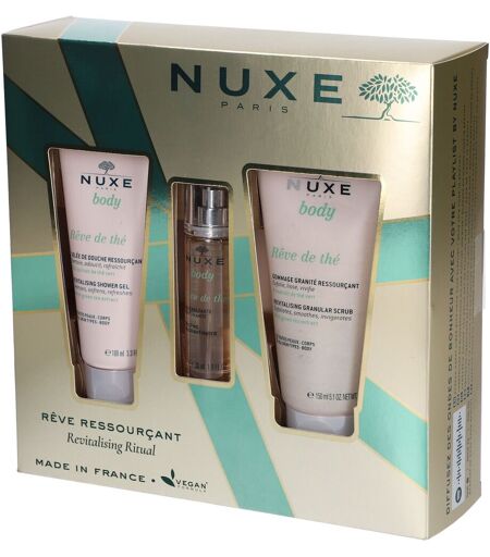 NUXE Geschenkset Rêve de Thé Dieses Set besteht aus: NUXE Rêve de Thé Belebendes Duschgel NUXE Rêve de Thé Vitalisierendes Duftspray NUXE Rêve de Thé Belebendes Granita-Peeling NUXE Rêve de Thé Belebendes Duschgel Die Hautpflege Rêve de Thé richtet sich an Frauen, die ihren Körper pflegen und sich gleichzeitig verwöhnen möchten, indem sie sich einen Wohlfühlmoment für Körper und Geist gönnen. Als Nachfolger der beliebten Nuxe Body Serie überzeugt Sie mit verbesserten Texturen und einem neuen frischen Duft. Das belebende Nuxe Body Reve de The Duschgel reinigt die Haut sanft dank einer pflanzlichen waschaktiven Substanz ohne Sulfate. Grüntee-Extrakt ist feuchtigkeitsspendend und sorgt für ein angenehmes Hautgefühl. Nach der Anwendung fühlt sich die Haut geschmeidig, und frisch an. Die frische und zarte Geltextur schäumt beim einmassieren wohltuend auf und lässt sich sehr leicht abspülen. Der Duft mit Noten von Rhabarber, frischen Kräutern und grünem Tee beleben den Geist und erfrischen die Sinne Wirksamkeit bestätigt Die Haut wird sanft gereinigt finden 95% der Anwenderinnen (1) Die Haut ist weich für 100% der Anwenderinnen (1) Das Produkt respektiert die Haut für 100% der Anwenderinnen (2) Die Haut ist frisch für 95% der Anwenderinnen (1) Anwendungstest - 20 Freiwillige. Prozentsatz der Zufriedenheit: (1) Unmittelbar nach der Anwendung. (2) Nach 21 Tagen. Reinigung Eine tägliche Reinigung der Haut ist entscheidend, um alle Unreinheiten zu beseitigen und zu verhindern, dass sie sich festsetzen und die Poren verstopfen. Zwar ist die Reinigung der Haut sehr wichtig, aber sie sollte immer sanft und schonend erfolgen, ohne sie abzuschälen. Nur so bleibt der Hydrolipidfilm erhalten, der unsere Haut von Natur aus umhüllt und vor äußeren Reizen schützt. Stimmen Sie Ihre Körperpflege unbedingt auf Ihren Hauttyp ab. Normale Haut benötigt in der Regel Feuchtigkeit und trockene Haut eine rückfettende Pflege mit Lipiden. Hier empfiehlt sich die reichhaltige Rêve de Miel Serie von Nuxe. Eigenschaften: milde Körperreinigung, zart pflegend und erfrischend sanfte Reinigung mit natürlichen Tensiden, welche die Bedürfnisse der Haut berücksichtigen feuchtigkeitsspendendes Grüntee-Extrakt sorgt für ein angenehmes Hautgefühl Die erfrischende, zart schmelzende Gelée-Textur, schäumt die Haut wunderbar ein Mit 95% natürlichen Inhaltstoffen Hauttyp: Normale Haut, trockene Haut; empfindliche Haut, feuchtigkeitsarme Haut, Körperreinigung, Körperpflege. NUXE Rêve de Thé Vitalisierendes Duftspray Das vitalisierende Duftspray mit belebender und regenerierender Wirkung regt mit seinen olfaktorischen Noten aus Rhabarber, grünem Tee und frischen Kräutern die Sinne an. Der spritzige Duft verschafft ein Gefühl von Frische und umhüllt die Haut mit einem Nebel voller Wohlbefinden. NUXE Rêve de Thé Belebendes Granita-Peeling Die Produktserie Rêve de Thé richtet sich an Frauen, die ihren Körper pflegen und sich gleichzeitig verwöhnen möchten, indem sie sich einen Wohlfühlmoment für... ...