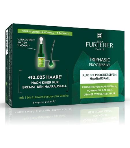 Anwendungsgebiet von Furterer TRIPHASIC Progressive Kur Die innovative Furterer TRIPHASIC Progressive Kur – mit patentierter Aktivstoffkombination – hilft, den anlagebedingten Haarausfall zu verlangsamen. Wirkungsweise von Furterer TRIPHASIC Progressive Kur Haarausfall, bei Frauen wie auch bei Männern, ist ein großes emotionales und hochsensibles Thema. Ob temporärer oder anlagebedingter Haarausfall: Furterer TRIPHASIC Progressive Kur hilft Ihnen, mit der Kombination exklusiver und einzigartiger Aktivstoffe aus der Natur den Haarausfall zu bremsen und den Haarlebenszyklus zu verlängern.