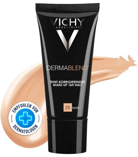 Anwendungsgebiet von Vichy Dermablend Make up 25 Vichy Dermablend Make up 25 ist eine Foundation mit hoher Deckkraft, die der Haut bis zu 24 Stunden Feuchtigkeit spendet. Die Grundierung deckt dank 25 % Pigmentanteile Makel wie kleine Narben, geplatzte Äderchen, Rötungen, Augenringe, Mitesser oder Pickelmale gezielt ab. Vichy Dermablend Make up 25 wurde von der Stiftung Warentest ausgezeichnet und ist auch für empfindliche Haut geeignet. Die Foundation sorgt bis zu 16 Stunden lang für einen ebenmäßigen Teint ohne Maskeneffekt oder Glanz. Nicht komedogen.Wirkungsweise von Vichy Dermablend Make up 25Hautunregelmäßigkeiten werden durch das Vichy Dermablend Make up 25 sofort perfekt abgedeckt. Dabei gibt es keine harten Ränder und keine Fleckenbildung. Das Vichy Dermablend Make up 25 macht die Haut zart und geschmeidig. Gleichzeitig wirkt der Teint strahlend und ebenmäßig. Wirkstoffe / Inhaltsstoffe / ZutatenInhaltsstoffe von Vichy Dermablend Make up 25: Aqua/Water, Cyclopentasiloxane, Dimethicone, Glycerin, Polyglyceryl-4 Isostearate, Cetyl PEG/PPG-10/1 Dimethicone, Hexyl Laurate, Pentylene Glycol, Disteardimonium Hectorite, Methylparaben, Cellulose Gum, Aluminum hydroxide, Magnesium Sulfate, Phenoxyethanol, Disodium stearoyl Glutamate, Tristearin, Acetylated Glycol Stearate, Acrylates Copolymer, Butylparaben, CI77891/Titanium Dioxide, CI 77491/Iron Oxides, CI 77492, CI 77499 GegenanzeigenBei bekannter Überempfindlichkeit gegen einen der Inhaltsstoffe sollte dieses Produkt nicht angewendet werden.DosierungAnwendungsempfehlung von Vichy Dermablend Make up 25: Tragen Sie Vichy Dermablend Make up 25 mit leichten Bewegungen von innen nach außen im Gesicht auf. Verstreichen Sie sorgfältig die Konturen an Hals, Ohren und Haaransatz, um Ränder zu vermeiden. Wiederholen Sie die Anwendung der Foundation, bis Sie das gewünschte Abdeckergebnis erreichenHinweiseDas Vichy Dermablend Make up 25 enthält keine Duftstoffe un ...
