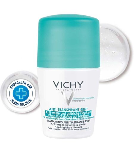 Anwendungsgebiet von Vichy Deo Roll-on Anti Flecken 48hVichy Deo Roll-on Anti Flecken 48h ist ideal für Männer und Frauen, die nach einem wirksamen Anti-Transpirant suchen, dass keine Rückstände auf Textilien hinterlässt.Wirkstoffe / Inhaltsstoffe / ZutatenInhaltsstoffe von Vichy Deo Roll-on Anti Flecken 48h: ISOBUTANE - AQUA / WATER - DIMETHICONE - ALUMINUM CHLOROHYDRATE - PHENOXYETHANOL - LAURYL PEG-9 POLYDIMETHYLSILOXYETHYL DIMETHICONE - TETRASODIUM GLUTAMATE DIACETATE - DIMETHICONOL - PARFUM / FRAGRANCEGegenanzeigenBei bekannter Überempfindlichkeit gegenüber einem der oben genannten Inhaltsstoffe sollte dieses Produkt nicht angewendet werden.DosierungAnwendungsempfehlung von Vichy Deo Roll-on Anti Flecken 48h: Täglich in der sauberen und trockenen Achselhöhle auftragen. Vichy Deo Roll-on Anti Flecken 48h können in Ihrer Versandapotheke www.juvalis.de erworben werden. ...