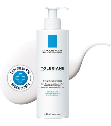 Anwendungsgebiet von Roche Posay Toleriane ReinigungsfluidRoche Posay Toleriane Reinigungsfluid besitzt eine sehr hohe Hautverträglichkeit und eignet sich somit sowohl für die schonende Reinigung empfindlicher, leicht reizbarer oder zu Allergien neigender Haut als auch gut für die von Säuglingshaut. Roche Posay Toleriane Reinigungsfluid entfernt Make-up, besonders im Bereich der Augen, zuverlässig.Wirkungsweise von Roche Posay Toleriane ReinigungsfluidDas in Roche Posay Toleriane Reinigungsfluid enthaltene Thermalwasser wirkt hydratisierend und beruhigend. Glycerin bindet das Wasser, um den Feuchtigkeitsgehalt der Hornschicht nachhaltig zu verbessern.Wirkstoffe / Inhaltsstoffe / ZutatenInhaltsstoffe (nach INCI) von La Roche Posay Toleriane Reinigungsfluid sind: