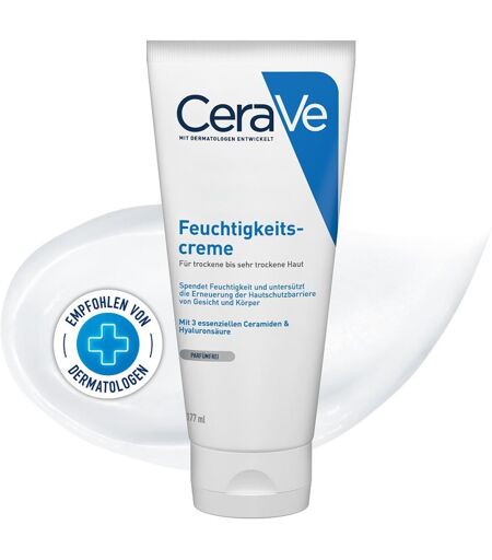 Anwendungsgebiet von Cerave FeuchtigkeitscremeDie Cerave Feuchtigkeitscreme versorgt die Haut dank patentierter Wirkstoff-Freisetzung 24 Stunden mit Feuchtigkeit. Die pflegende Körpercreme für trockene Haut stärkt die natürliche Hautschutzbarriere. Wirkungsweise von Cerave FeuchtigkeitscremeDie Hautpflege zeichnet sich durch ihre patentierte MVE-Wirkstoff-Freisetzung aus, die die aktiven Wirkstoffe über den Tag verteilt an die Haut freigibt. Dank Hyaluron und drei essenziellen Ceramiden wird die Haut kontinuierlich mit Feuchtigkeit versorgt und die natürliche Hautschutzbarriere gestärkt – für ein angenehm weiches Hautgefühl. Die Cerave Feuchtigkeitscreme enthält keine Dufstoffe und eignet sich auch bei zu Neurodermitis neigende Haut und für Allergiker. Wirkstoffe / Inhaltsstoffe / ZutatenCerave Feuchtigkeitscreme enthält: Aqua / Water • Glycerin • Cetearyl Alcohol • Caprylic/Capric Triglyceride • Cetyl Alcohol • Ceteareth-20 • Petrolatum • Potassium Phosphate • Ceramide Np • Ceramide Ap • Ceramide Eop • Carbomer • Dimethicone • Behentrimonium Methosulfate • Sodium Lauroyl Lactylate • Sodium Hyaluronate • Cholesterol • Phenoxyethanol • Disodium Edta • Dipotassium Phosphate • Tocopherol • Phytosphingosine • Xanthan Gum • EthylhexylglycerinGegenanzeigenBei bekannter Überempfindlichkeit gegenüber einem der oben genannten Inhaltsstoffe sollte das Produkt nicht verwendet werden.DosierungAnwendungsempfehlung von Cerave Feuchtigkeitscreme: Die Cerave Feuchtigkeitscreme großzügig und beliebig oft auf Gesicht und Körper auftragen und sanft einmassieren. Dank ihrer sanften, nicht fettenden Formel, eignet sich die feuchtigkeitsspendende Pflegecreme für die tägliche Anwendung. Sie ist sowohl für Erwachsene als auch für sensible Kinderhaut, Allergiker und bei zu Neurodermitis neigender Haut geeignet. Die Augenkonturen beim Auftragen aussparen. Ideal nach der Verwendung eines CeraVe Rein ...