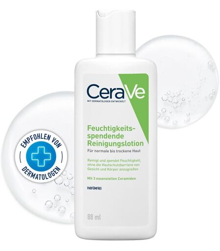 Anwendungsgebiet von CeraVe Feuchtigkeitsspendende ReinigungslotionDie CeraVe Feuchtigkeitsspendende Reinigungslotion mit Hyaluron und drei essenziellen Ceramiden reinigt sanft, versorgt die Haut mit Feuchtigkeit und stärkt die natürliche Schutzbarriere der Haut. Wirkungsweise von CeraVe Feuchtigkeitsspendende ReinigungslotionDie CeraVe Feuchtigkeitsspendende Reinigungslotion mit Hyaluron, den drei essenziellen Ceramiden 1, 3 und 6-II und Glycerin reinigt schonend, fördert den Erhalt der natürlichen Hautschutzbarriere und erhöht die Hautfeuchtigkeit ab der ersten Anwendung. Dank der MVE-Technologie werden die Aktiv-Wirkstoffe schrittweise freigesetzt und wirken so besonders lange. Die CeraVe Feuchtigkeitsspendende Reinigungslotion schäumt nicht, ist nicht-komedogen und verzichtet auf Duftstoffe – auch ideal für Kinderhaut und Allergiker geeignet. Wirkstoffe / Inhaltsstoffe / ZutatenCeraVe Feuchtigkeitsspendende Reinigungslotion enthält: Aqua / Water • Glycerin • Cetearyl Alcohol • Phenoxyethanol • Stearyl Alcohol • Cetyl Alcohol • Peg-40 Stearate • Behentrimonium Methosulfate • Glyceryl Stearate • Polysorbate 20 • Ethylhexylglycerin • Potassium Phosphate • Disodium Edta • Dipotassium Phosphate • Sodium Lauroyl Lactylate • Ceramide Np • Ceramide Ap • Phytosphingosine • Cholesterol • Sodium Hyaluronate • Xanthan Gum • Carbomer • Tocopherol • Ceramide Eop GegenanzeigenBei bekannter Überempfindlichkeit gegenüber einem der oben genannten Inhaltsstoffe sollte das Produkt nicht verwendet werden.DosierungAnwendungsempfehlung von CeraVe Feuchtigkeitsspendende Reinigungslotion: Die CeraVe Feuchtigkeitsspendende Reinigungslotion für trockene Haut in die Handflächen geben und auf das angefeuchtete Gesicht oder den Körper auftragen. Anschließend sanft einmassieren und mit lauwarmem Wasser gründlich abspülen. Die Augenpartie aussparen und bei Kontakt mit den Augen diese umgehend gründl ...
