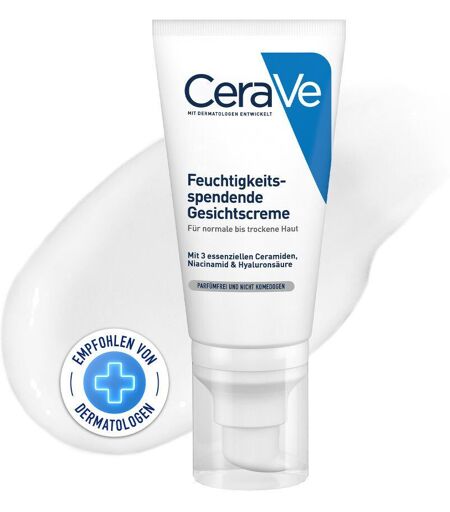 CeraVe Feuchtigkeitsspendende Gesichtscreme für normale bis trockene Haut Die Nachtcreme von CeraVe versorgt die Haut mit aktiven Inhaltsstoffen, die sie nachhaltig vor dem Austrocknen schützen. Dank der besonderen Wirkstoff-Freisetzung werden sie kontinuierlich freigesetzt – für ein langanhaltend seidiges und geschmeidiges Hautgefühl. Während Hyaluron die Haut intensiv mit Feuchtigkeit versorgt, füllen die essenziellen Ceramide 1, 3 und 6-II die natürliche Hautschutzbarriere auf und wirken zugleich regenerierend. Die sanft formulierte Feuchtigkeitsspendende Gesichtscreme von CeraVe eignet sich auch für Allergiker. CeraVe Feuchtigkeitsspendende Gesichtscreme mit LSF 50 für normale bis trockene Haut Die CeraVe Feuchtigkeitscreme mit LSF 50 schützt normale und trockene Haut vor täglicher UVA- und UVB-Strahlung und Umwelteinwirkungen. Drei essenzielle Ceramide helfen bei der Erneuerung der Hautschutzbarriere und in Kombination mit der MVE-Technologie wird die Haut kontinuierlich und intensiv mit Feuchtigkeit versorgt - bis zu 24 Stunden. Angenehm leichte Textur mit Vitamin E und Niacinamiden Die angenehme Formel mit Vitamin E und Niacinamiden wirkt beruhigend und ist besonders leicht aufzutragen. Auf Duftstoffe und Parabene wird verzichtet, die Gesichtscreme ist außerdem nicht-komodogen. Anwendung: Die CeraVe Feuchtigkeitsspendende Gesichtscreme täglich als Bestandteil der abendlichen Hautpflegeroutine auf die gereinigte Haut auftragen. Anschließend sanft mit den Fingerspitzen einmassieren. Die Augenpartie aussparen und bei Kontakt mit den Augen diese sofort mit klarem Wasser ausspülen. Die gemeinsam mit Dermatologen entwickelte CeraVe Feuchtigkeitscreme für das Gesicht ist sehr gut verträglich, geruchsneutral und kann somit auch bei empfindlicher und zu Allergien neigender Haut angewendet werden. Besonders wirksam ist die CeraVe Nachtcreme in Kombination mit der CeraVe Creme-zu-Schaum Reinigung und der CeraVe Feuchtigkeitsspendende Gesichtscreme mit LSF 25 als Tagespflege. Inhaltsstoffe: AQUA / WATER • GLYCERIN • CAPRYLIC/CAPRIC TRIGLYCERIDE • NIACINAMIDE • CETEARYL ALCOHOL • POTASSIUM PHOSPHATE • CERAMIDE NP • CERAMIDE AP • CERAMIDE EOP • CARBOMER • DIMETHICONE • CETEARETH-20 • BEHENTRIMONIUM METHOSULFATE • SODIUM LAUROYL LACTYLATE • SODIUM HYALURONATE • CHOLESTEROL • PHENOXYETHANOL • DISODIUM EDTA • DIPOTASSIUM PHOSPHATE • CAPRYLYL GLYCOL • PHYTOSPHINGOSINE • XANTHAN GUM • POLYGLYCERYL-3 DIISOSTEARATE • ETHYLHEXYLGLYCERIN Hersteller: 62, Quai Charles Pasqua 92300 Levallois-Perret France fragen@loreal-group.com*Gutschein gültig bei Online-Bestellung ab dem genannten Mindestbestellwert (ausgenommen preisgebundene Bücher, verschreibungspflichtige Produkte, Artikel von Drittanbietern (Marktplatz Partnern) sowie bei einer Now!-Lieferung)) für die folgenden Produkte des Herstellers L'Oreal Deutschland GmbH: 18168763, 18386632, 18029926, 14017671, 14017493, 18848127, 14017642, 17572901, 14408839, 14017553, 14017659, 16827457, 17505916, 18909917,... ...