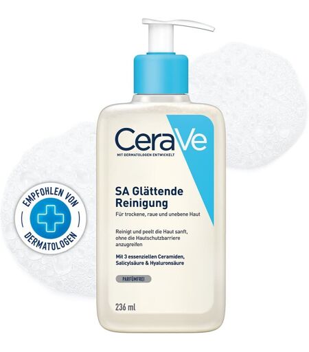 Anwendungsgebiet von CeraVe SA Glättende ReinigungCeraVe SA Glättende Reinigung für Gesicht und Körper mit Salicylsäure, Urea, Hyaluron und essenziellen Ceramiden glättet die Haut, spendet Feuchtigkeit und stärkt die natürliche Hautschutzbarriere. Wirkungsweise von CeraVe SA Glättende ReinigungBeruhigende Gesichtsreinigung mit peelendem Effekt für trockene, raue und unebene Haut. Die CeraVe SA Glättende Reinigung befreit die Haut von Schmutz, Öl und überschüssigem Talg, spendet langanhaltende Feuchtigkeit und stärkt die natürliche Schutzbarriere der Haut. Das gemeinsam mit Dermatologen entwickelte CeraVe SA Glättende Reinigung für trockene Haut enthält glättende Salicylsäure, hydratisierendes Hyaluron und Urea sowie drei essenzielle Ceramide zur Aufrechterhaltung der Hautschutzbarriere. Dank der sanften, hautglättenden Formel wird die Haut und Hautschutzbarriere durch den Peeling-Effekt nicht gereizt. Wirkstoffe / Inhaltsstoffe / ZutatenCeraVe SA Glättende Reinigung enthält: Aqua / Water • Sodium Lauroyl Sarcosinate • Cocamidopropyl Hydroxysultaine • Glycerin • Niacinamide • Gluconolactone • Sodium Methyl Cocoyl Taurate • Peg-150 Pentaerythrityl Tetrastearate • Ceramide Np • Ceramide Ap • Ceramide Eop • Carbomer • Calcium Gluconate • Salicylic Acid • Sodium Benzoate • Sodium Lauroyl Lactylate • Cholesterol • Phenoxyethanol • Disodium Edta • Tetrasodium Edta • Hydrolyzed Hyaluronic Acid • Phytosphingosine • Xanthan Gum • EthylhexylglycerinGegenanzeigenBei bekannter Überempfindlichkeit gegenüber einen der oben genannten Inhaltsstoffe sollte dieses Produkt nicht angewendet werden.DosierungAnwendungsempfehlung von CeraVe SA Glättende Reinigung: Die CeraVe SA Glättende Reinigung regelmäßig am Morgen und/oder am Abend anwenden. Dafür eine kleine Menge des Reinigungsgels aus dem Pumpspender entnehmen und auf die angefeuchtete Haut auftragen. Anschließend sanft e ...