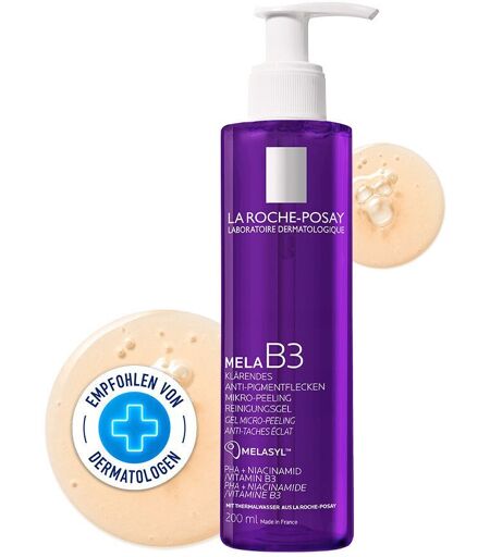 La Roche Posay Mela B3 Reinigungsgel MELA B3 Klärendes Reinigungsgel bietet eine optimale Gesichtsreinigung bei Pigmentflecken. Die Formel mit dem patentierten Wirkstoff Melasyl und Niacinamid (Vitamin B3) bekämpft Pigmentflecken und bewahrt dabei den natürlichen Hautton. PHA bereitet die Haut optimal vor, damit Wirkstoffe besser aufgenommen werden können. Anschließend eignet sich die Anwendung des MELA B3 Anti-Pigmentflecken-Serums und der MELA B3 LSF 30 Tagespflege. Anwendung: Eine haselnussgroße Menge des MELA B3 Reinigungsgels zwischen den Händen mit etwas Wasser aufschäumen. Auf die Haut von Gesicht, Hals und Dekolleté auftragen und sanft einmassieren. Anschließend gründlich abspülen und das Gesicht sanft trocken tupfen. Für eine optimale Komplett-Routine bei Pigmentflecken zusätzlich das MELA B3 Anti-Pigmentflecken-Serum auftragen. Inhaltsstoffe: AQUA / WATER / EAU • GLYCERIN • COCO-BETAINE • PROPANEDIOL • SODIUM COCOYL GLYCINATE • PEG-120 METHYL GLUCOSE DIOLEATE • SODIUM HYDROXIDE • SODIUM CHLORIDE • CITRIC ACID • GLUCONOLACTONE • CERAMIDE NP • NIACINAMIDE • 2-MERCAPTONICOTINOYL GLYCINE • SODIUM THIOSULFATE • DISODIUM EDTA • CAPRYLOYL GLYCINE • CAPRYLYL GLYCOL • TRISODIUM ETHYLENEDIAMINE DISUCCINATE • PENTYLENE GLYCOL • ACRYLATES COPOLYMER • TOCOPHEROL • TOCOPHERYL ACETATE • PARFUM / FRAGRANCEHersteller: 86270 La Roche-Posay, France fragen@loreal-group.com ...