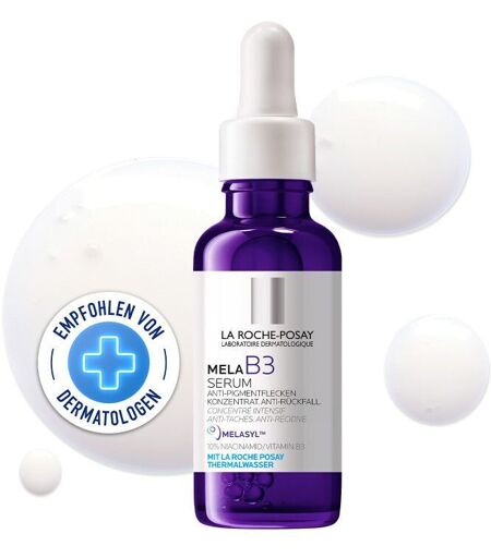 La Roche Posay Mela B3 Serum gegen Pigmentflecken und Niacinamid Anti-Pigmentflecken-Serum mit Melasyl: Patentierter Wirkstoff gegen Pigmentflecken Nach 18 Jahren Forschung haben wir endlich neue wissenschaftliche Erkenntnisse: Unser patentiertes Melasyl arbeitet mit dem natürlichen Melanin-Prozess der Haut. Das bedeutet, dass Melanin-Vorläufer vor ihrer Transformation – also bevor Pigmentflecken entstehen können – abgefangen werden. Dabei bewahrt und optimiert das Melasyl jeden natürlichen Hautton. 2 Wochen Anti-Rückfall: Multifunktionale Formel mit allen Hebeln zur Bekämpfung von Pigmentflecken Das innovative Gesichtsserum von La Roche Posay bekämpft selbst Pigmentflecken und Hyperpigmentierungen dank einer multifunktionalen Formel: Während Melasyl überschüssiges Melanin abfängt, wirkt das enthaltene Niacinamid entzündungshemmend und beruhigend. LHA, Carnosin und Retinyl Palmitat dienen der Exfolierung, Anti-Oxidation und der Stärkung der Epidermis. Hyaluron und Glycerin versorgen die Haut zusätzlich mit wertvoller Feuchtigkeit. So ist bereits nach 4 Wochen erste Milderung zu sehen. Nach 8 Wochen sind auch starke Pigmentflecken sichtbar gemildert. Die innovative Formel sorgt für 2 Wochen Anti-Rückfall und langfristig einen ebenmäßigeren Hautton. Besondere Eigenschaften des Anti-Pigmentflecken-Serum MELA B3: Serum gegen Pigmentflecken mit patentiertem Melasyl und 10 % Niacinamid sowie LHA, Carnosin, Retinyl Palmitat, Hyaluron und Glycerin Einzigartiger Wirkmechanismus: Überschüssiges Melanin wird abgefangen, bevor Hyperpigmentierungen entstehen können Erste sichtbare Milderung von Pigmentflecken bereits nach 4 Wochen 2 Wochen Anti-Rückfall: Für einen ebenmäßigeren Hautton Anwendung: Morgens und/oder abends das Anti-Pigmentflecken-Serum MELA B3 von La Roche Posay mithilfe des integrierten Pipetten-Abstreifers entnehmen. 3-4 Tropfen des Gesichtsserums auf die zuvor gereinigte Haut von Gesicht, Hals und Dekolleté auftragen und mit den Fingerspitzen sanft einmassieren. Dank der leichten Gel-Textur zieht das Anti-Pigmentflecken-Serum schnell ein und hinterlässt ein angenehmes Hautgefühl. Anschließend mit der gewohnten Pflegeroutine fortfahren. Für noch bessere Ergebnisse eignet sich die Anwendung von MELA B3 Reinigung und MELA B3 Pflege mit LSF 30. Inhaltsstoffen: 2039125 10 - INGREDIENTS: AQUA / WATER / EAU • DIMETHICONE • NIACINAMIDE • GLYCERIN • PROPYLENE GLYCOL • POLYSILICONE-11 • SILICA • BIS-PEG/PPG-16/16 PEG/PPG-16/16 DIMETHICONE • CYSTOSEIRA TAMARISCIFOLIA EXTRACT • 2-MERCAPTONICOTINOYL GLYCINE • PEG-20 METHYL GLUCOSE SESQUISTEARATE • SODIUM HYALURONATE • SODIUM HYDROXIDE • SODIUM THIOSULFATE • CARNOSINE • POLOXAMER 338 • AMMONIUM POLYACRYLOYLDIMETHYL TAURATE • DIPOTASSIUM GLYCYRRHIZATE • CAPRYLIC/CAPRIC TRIGLYCERIDE • CAPRYLOYL SALICYLIC ACID • CAPRYLYL GLYCOL • CITRIC ACID • TRISODIUM ETHYLENEDIAMINE DISUCCINATE • XANTHAN GUM • PENTYLENE GLYCOL • OCTYLDODECANOL • RETINYL PALMITATE • TOCOPHEROL • PENTAERYTHRITYL TETRA-DI-T-BUTYL... ...