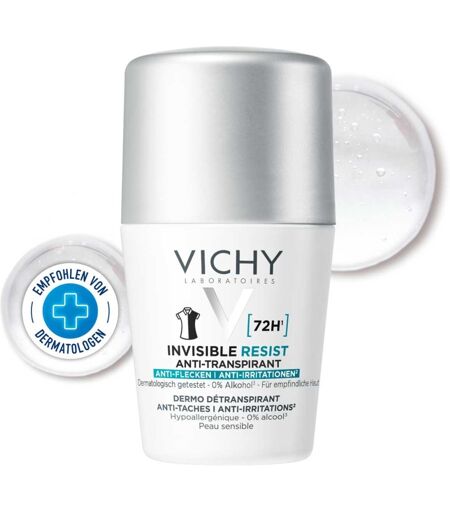 Wirkungsweise von Vichy Deo Roll-on 72h Anti-FleckenDer Vichy Deo Roll-on 72h Anti-Flecken reguliert bis zu 72 Stunden lang extreme Schweißbildung und hinterlässt dank seiner Anti-Flecken-Formel keine gelblichen und weißen Rückstände auf farbiger Kleidung. Durch den hypoallergenen Wirkstoffkomplex und die alkoholfreie Formel, ist das Deodorant besonders hautfreundlich und somit für empfindliche Haut geeignet.