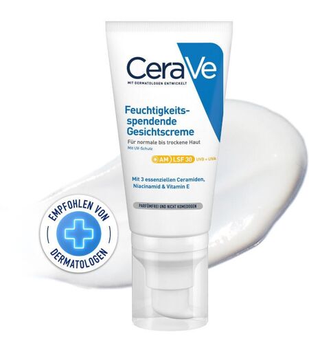 CeraVe Feuchtigkeitsspendende Gesichtscreme mit LSF 30 für normale bis trockene Haut Die Tagescreme mit Lichtschutz von CeraVe durchfeuchtet die Haut und versorgt sie mit wirksamen Inhaltsstoffen. Dank der patentierten Wirkstoff-Freisetzung (MVE) werden die Inhaltsstoffe über den Tag verteilt freigesetzt und hinterlassen ein langanhaltend seidiges und geschmeidiges Hautgefühl. Die sante Formel mit Hyaluron versorgt trockene Haut intensiv mit Feuchtigkeit, die Ceramide 1, 3 und 6-II stärken die natürliche Hautschutzbarriere und der LSF 30 schützt vor UVA- und UVB-Strahlen. Die nicht-komedogene Creme verzichtet auf Duftstoffe und Parabene. Anwendung Eine kleine Menge der CeraVe Feuchtigkeitsspendende Gesichtscreme mit LSF 30 täglich am Morgen auf die gereinigte Haut auftragen und sanft mit den Fingerspitzen einmassieren. Die Augenpartie dabei aussparen. Bei Kontakt mit den Augen diese umgehend gründlich ausspülen. Da die gemeinsam mit Dermatologen entwickelte CeraVe Tagescreme geruchsneutral ist, eignet sie sich auch optimal für sehr empfindliche und zu Allergien neigende Haut. Optimal ist die Anwendung in Kombination mit der Creme-zu-Schaum Reinigung von CeraVe. Inhaltsstoffe AQUA / WATER • GLYCERIN • ISOPROPYL PALMITATE • ETHYLHEXYL SALICYLATE • NIACINAMIDE • PENTYLENE GLYCOL • BIS-ETHYLHEXYLOXYPHENOL METHOXYPHENYL TRIAZINE • BUTYL METHOXYDIBENZOYLMETHANE • ZEA MAYS STARCH / CORN STARCH • ETHYLHEXYL TRIAZONE • POTASSIUM CETYL PHOSPHATE • DIISOPROPYL SEBACATE • ORYZA SATIVA CERA / RICE BRAN WAX • STEARIC ACID • CERAMIDE NP • CERAMIDE AP • CERAMIDE EOP • CARBOMER • GLYCERYL STEARATE • CETEARYL ALCOHOL • TRIETHANOLAMINE • BEHENTRIMONIUM METHOSULFATE • TRIETHYL CITRATE • SODIUM HYALURONATE • SODIUM LAUROYL LACTYLATE • MYRISTIC ACID • CHOLESTEROL • PALMITIC ACID • TOCOPHEROL • CAPRYLYL GLYCOL • TRISODIUM ETHYLENEDIAMINE DISUCCINATE • XANTHAN GUM • PHYTOSPHINGOSINE • ACRYLATES/C10-30 ALKYL ACRYLATE CROSSPOLYMER • BENZOIC ACID • PEG-100 STEARATEHersteller: 62, Quai Charles Pasqua 92300 Levallois-Perret France fragen@loreal-group.com*Gutschein gültig bei Online-Bestellung ab dem genannten Mindestbestellwert (ausgenommen preisgebundene Bücher, verschreibungspflichtige Produkte, Artikel von Drittanbietern (Marktplatz Partnern) sowie bei einer Now!-Lieferung)) für die folgenden Produkte des Herstellers L'Oreal Deutschland GmbH: 18168763, 18386632, 18029926, 14017671, 14017493, 18848127, 14017642, 17572901, 14408839, 14017553, 14017659, 16827457, 17505916, 18909917, 18168757, 18168786, 15660854, 17572918, 15660819, 14017524, 17636587, 18259098, 18719861, 17862148, 9635295, 2330486, 10779349, 16652236, 19948463, 19948581, 16349153, 18783899, 19155567, 19380330, 16652242, 17507772, 17507766, 18314087, 15293746, 19398962, 17258398, 11594422, 19668551, 11594445, 6712977, 6712983, 10713474, 16599909, 14060537, 19512843, 7789479, 18092497, 17200855, 14360937, 18119902, 15625792, 13515444, 17258458, 17258429, 17258441, 00837985. Voraussetzung ist die Angabe des... ...
