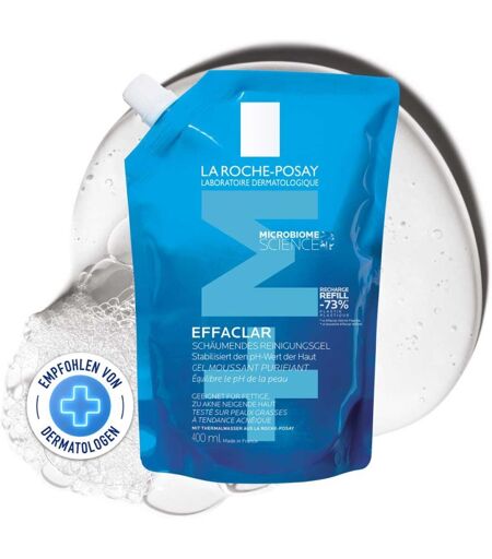 Anwendungsgebiet von La Roche Posay Effaclar Schäumendes Reinigungsgel NachfüllpackLa Roche Posay Effaclar Schäumendes Reinigungsgel Nachfüllpack befreit zu Akne neigende, ölige Haut von Unreinheiten und überschüssigem Talg. Wirkt Glanz entgegen und beruhigt die Haut.Wirkungsweise von La Roche Posay Effaclar Schäumendes Reinigungsgel NachfüllpackLa Roche Posay Effaclar Schäumendes Reinigungsgel Nachfüllpack befreit die Haut und Poren effektiv von überschüssigem Talg und hinterlässt ein sauberes, erfrischtes Hautgefühl. Dank der sanften Formel mit beruhigendem Thermalwasser aus La Roche-Posay mildert das Reinigungsgel Reizungen sowie Irritationen und eignet sich für sehr empfindliche Haut. Seine Formel ist alkoholfrei und hat einen physiologischen pH-Wert von 5,5. Somit eignet sich die Reinigung für unreine, fettige Haut ideal für die tägliche Anwendung.Wirkstoffe / Inhaltsstoffe / ZutatenLa Roche Posay Effaclar Schäumendes Reinigungsgel Nachfüllpack enthält: Aqua / Water • Sodium Laureth Sulfate • Peg-8 • Coco-Betaine • Hexylene Glycol • Sodium Chloride • Punica Granatum Pericarp Extract • Zinc Pca • Peg-120 Methyl Glucose Dioleate • Sodium Citrate • Sodium Hydroxide • Caprylyl Glycol • Citric Acid • Trisodium Ethylenediamine Disuccinate • Maltodextrin • Pentylene Glycol • Sodium Benzoate • Phenoxyethanol • Parfum / FragranceGegenanzeigenBei bekannter Überempfindlichkeit gegenüber einem der oben genannten Inhaltsstoffe sollte das Produkt nicht verwendet werden.DosierungAnwendungsempfehlung von La Roche Posay Effaclar Schäumendes Reinigungsgel Nachfüllpack: Täglich am Morgen und/oder am Abend anwenden. Die Haut mit lauwarmem Wasser anfeuchten, um die Poren zu öffnen. Die Reinigung in den Händen verteilen, auf T-Zone und Hals auftragen und sanft mit kreisenden Bewegungen einmassieren. Die Rückstände anschließend gründlich mit kaltem Wasser abspülen, um die Poren wieder zu schließen. ...