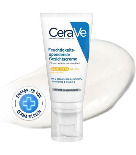 CeraVe Feuchtigkeitsspendende Gesichtscreme mit LSF 50 für normale bis trockene Haut Die CeraVe Feuchtigkeitscreme mit LSF 50 schützt normale und trockene Haut vor täglicher UVA- und UVB-Strahlung und Umwelteinwirkungen. Drei essenzielle Ceramide helfen bei der Erneuerung der Hautschutzbarriere und in Kombination mit der MVE-Technologie wird die Haut kontinuierlich und intensiv mit Feuchtigkeit versorgt - bis zu 24 Stunden. Angenehm leichte Textur mit Vitamin E und Niacinamiden Die angenehme Formel mit Vitamin E und Niacinamiden wirkt beruhigend und ist besonders leicht aufzutragen. Auf Duftstoffe und Parabene wird verzichtet, die Gesichtscreme ist außerdem nicht-komodogen. Anwendung: Die CeraVe Feuchtigkeitsspendende Gesichtscreme mit LSF 50 kann als Tagescreme verwendet werden. Eine kleine Menge der Hautcreme wird morgens auf die gereinigte Gesichtshaut aufgetragen und anschließend leicht einmassiert. Die Augenpartie sollte dabei ausgespart werden. Bei Augenkontakt die Augen umgehend gründlich mit klarem Wasser ausspülen. Bei Bedarf ebenfalls auf Hals- und Nackenpartie anwenden. Inhaltsstoffe: AQUA / WATER • GLYCERIN • ISOPROPYL PALMITATE • BIS-ETHYLHEXYLOXYPHENOL METHOXYPHENYL TRIAZINE • ETHYLHEXYL SALICYLATE • NIACINAMIDE • PENTYLENE GLYCOL • BUTYL METHOXYDIBENZOYLMETHANE • ETHYLHEXYL TRIAZONE • PROPANEDIOL • ZEA MAYS STARCH / CORN STARCH • POTASSIUM CETYL PHOSPHATE • DIISOPROPYL SEBACATE • ORYZA SATIVA CERA / RICE BRAN WAX • STEARIC ACID • CERAMIDE NP • CERAMIDE AP • CERAMIDE EOP • CARBOMER • GLYCERYL STEARATE • CETEARYL ALCOHOL • TRIETHANOLAMINE • BEHENTRIMONIUM METHOSULFATE • TRIETHYL CITRATE • SODIUM HYALURONATE • SODIUM POLYACRYLATE • SODIUM LAUROYL LACTYLATE • MYRISTIC ACID • CHOLESTEROL • PALMITIC ACID • TOCOPHEROL • CAPRYLYL GLYCOL • CITRIC ACID • TRISODIUM ETHYLENEDIAMINE DISUCCINATE • XANTHAN GUM • PHYTOSPHINGOSINE • ACRYLATES/C10-30 ALKYL ACRYLATE CROSSPOLYMER • BUTYROSPERMUM PARKII BUTTER / SHEA BUTTER • BENZOIC ACID • PEG-100 STEARATEHersteller: 62, Quai Charles Pasqua 92300 Levallois-Perret France fragen@loreal-group.com*Gutschein gültig bei Online-Bestellung ab dem genannten Mindestbestellwert (ausgenommen preisgebundene Bücher, verschreibungspflichtige Produkte, Artikel von Drittanbietern (Marktplatz Partnern) sowie bei einer Now!-Lieferung)) für die folgenden Produkte des Herstellers L'Oreal Deutschland GmbH: 18168763, 18386632, 18029926, 14017671, 14017493, 18848127, 14017642, 17572901, 14408839, 14017553, 14017659, 16827457, 17505916, 18909917, 18168757, 18168786, 15660854, 17572918, 15660819, 14017524, 17636587, 18259098, 18719861, 17862148, 9635295, 2330486, 10779349, 16652236, 19948463, 19948581, 16349153, 18783899, 19155567, 19380330, 16652242, 17507772, 17507766, 18314087, 15293746, 19398962, 17258398, 11594422, 19668551, 11594445, 6712977, 6712983, 10713474, 16599909, 14060537, 19512843, 7789479, 18092497, 17200855, 14360937, 18119902, 15625792, 13515444, 17258458, 17258429, 17258441, 00837985. Voraussetzung ist die... ...