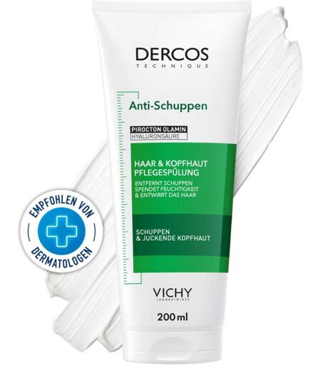 Anwendungsgebiet von Vichy Dercos Anti-Schuppen ConditionerDer Vichy Dercos Anti-Schuppen Conditioner ist für alle, die mehr Pflege in der Anti-Schuppen-Haarpflege brauchen: Die Spülung für alle Haartypen mildert Schuppen und versorgt die Haare mit Feuchtigkeit.Wirkungsweise von Vichy Dercos Anti-Schuppen ConditionerAls Ergänzung zum Anti-Schuppen Pflegeshampoo schenkt Vichy Dercos Anti-Schuppen Conditioner dem Haar eine Extraportion Pflege und spendet den Haaren dank Hyaluronsäure, Glycerin und Pflanzenölen bis zu 75 % mehr Feuchtigkeit. Dazu enthält die Haarspülung Pirocton-Olamin, ein Wirkstoff, der effektiv bei trockenen sowie fettigen Schuppen ist und die Kopfhaut beruhigt. Dadurch mildert der Anti-Schuppen Conditioner bis zu 77 % sichtbarer Schuppen* und reduziert Juckreiz um 92 %.* Die Spülung ist für jeden Haartyp sowie sensible Kopfhaut geeignet. *Klinischer Test an 33 Probanden mit 3 Anwendungen pro Woche über 4 WochenWirkstoffe / Inhaltsstoffe / ZutatenVichy Dercos Anti-Schuppen Conditioner enthält: