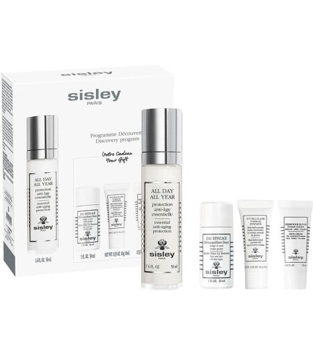 Das All Day All Year Set enthält die All Day All Year globale Anti-Aging Tagespflege, das hochwirksame, ultrasanfte Reinigungswasser Eau Efficace, die intensive Feuchtigkeitsmaske Hydra Flash und die Creme Pour Le Cou, welche den Hals strafft und tonisiert und das Gesichtsoval modelliert. Tagsüber verwendet unsere Haut ihre ganze Energie darauf sich selbst zu schützen. All Day All Year ist daher die perfekte Tagespflege, da sie wie ein globales Schutzschild wirkt, das die Haut schützt und ihre eigenen Abwehrkräfte* aktiviert, damit die Haut länger jung aussieht. Der physikalische Schutzschild bietet einen umfassenden Schutz auf der Hautoberfläche: Er schützt den ganzen Tag lang vor UVA- und UVB-Strahlen* dank eingekapselter Filter, die nicht in die Haut eindringenEr schützt vor Umweltbelastungen, sodass diese weniger in die Haut eindringen könnenDie angenehme, zart schmelzende Textur hinterlässt ein seidiges, nicht glänzendes Finish auf der Haut und ermöglicht ein schnelles Auftragen des Make-ups. Die Abwehrkräfte der Haut werden gestärkt. Sie ist glatter, weicher und komfortabler. Feine Linien und Falten werden gemildert, die Haut ist straffer. Sie ist schöner und strahlender und sieht länger jung aus. Eau Efficace ist ein Reinigungswasser mit Dreifachwirkung: befreit Gesicht und Augen von Make-up, reinigt und belebt die Haut. Die Pflegeformel enthält pflanzliche Saponine mit hoher Reinigungswirkung, die Unreinheiten und Spuren von Verschmutzungen, die sich im Laufe des Tages auf der Haut ansammeln, entfernen. Die Haut beginnt wieder zu strahlen. Eau Efficace befreit Gesicht und Augen gründlich selbst von hartnäckigem Make-up. Dank der Kombination zweier Aktivstoffe natürlichen Ursprungs mit beruhigender, geschmeidig machender und entspannender Wirkung (Lindenblütenwasser und Neroli-Extrakt) verleiht Eau Efficace ein angenehm frisches Hautgefühl voller Wohlbefinden. Für empfindliche Augen und für Kontaktlinsenträger geeignet. Hydra-Flash ist eine hochwirksame, feuchtigkeitsspendende Maske mit Pflanzenextrakten und ätherischen Ölen (Reis, Sesam, Majoran...). Sie ist eine spezielle Pflege für feuchtigkeitsarme Haut und verbessert die Wasserbindung. Die Haut fühlt sich sofort angenehm frisch an, sie ist wie aufgetankt. La crème pour le cou – Formule enrichie – wird den spezifischen Bedürfnissen von Frauen und Männern gerecht, die ihren Hals straffen und verfeinern möchten. Die Formel vereint vier Hauptwirkungen, um die Schönheit dieses empfindlichen Bereichs zu bewahren. 1. Straffender und Glättender Soforteffekt: Extrakt aus Haferkörnern: bildet einen durchgehenden und elastischen Film an der Hautoberfläche für ein spürbares "Lifting" - Gefühl. 2. Intensive festigende Wirkung: Extrakt aus Sojafasern: fördert die Elastizität der Dermis*, um das Erschlaffen der Haut zu bekämpfen und die Spannkraft der Haut zu verbessern. 3. Außergewöhnliche verfeinernde Wirkung: Koffein, fördert den Abbau von Fettzellen. Extrakt aus der Rotalge: begenzt die... ...