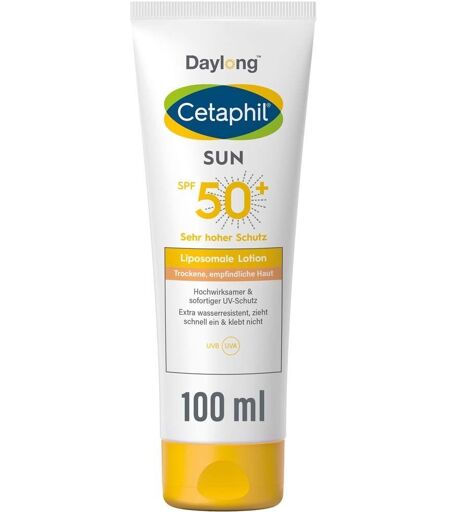 CETAPHIL Sun Daylong® SPF 50+ Liposomale Lotion CETAPHIL Sun Daylong SPF 50+ Liposomale Lotion: Zuverlässiger und langanhaltender Sonnenschutz für trockene und empfindliche Haut. CETAPHIL Sun Daylong™ SPF 50+ Liposomale Lotion: Sonnencreme für extrem sonnenempfindliche Haut CETAPHIL Sun Daylong SPF 50+ Liposomale Lotion ist eine dermatologische Sonnencreme für trockene, empfindliche Haut. Die in der Lotion enthaltenen photostabilen UV-Filter sorgen für sofortigen und hochwirksamen UVA- und UVB-Schutz. Dank ihrer liposomalen Eigenschaften lässt sich die Sonnenlotion leicht auf dem Körper verteilen, zieht schnell ein, klebt und fettet nicht und hinterlässt ein hervorragendes Hautgefühl. Die Sonnencreme verzichtet auf Parfüm und ist dermatologisch getestet. Die Lotion ist zudem schweiß- und extra wasserresistent, enthält pflegende Inhaltsstoffe wie Aloe Vera und Vitamin E und trocknet die Haut nicht aus. Sehr hoher Sonnenschutz von der Nr. 1 Empfehlung von Dermatologen1 – Alle Vorteile auf einen Blick Zuverlässig und langanhaltend: Sofortiger Sonnenschutz für trockene, empfindliche Haut Einfache Anwendung: 1 – 2 Mal eincremen am Tag reicht aus2 Angenehmes Hautgefühl: Zieht schnell ein und klebt nicht Extra wasserresistent: Sowohl in Süß- als auch in Salzwasser Ohne Parfüm Dermatologisch getestet Für wen ist CETAPHIL Sun Daylong™ SPF 50+ Liposomale Lotion geeignet? CETAPHIL Sun Daylong Liposomale Lotion mit LSF 50+ ist insbesondere für extrem sonnenempfindliche Hauttypen mit geringer Eigenschutzzeit geeignet. Die Sonnencreme pflegt trockene, empfindliche Haut mit Aloe Vera, Sorbitol und Vitamin E und verzichtet bewusst auf den Einsatz von Parfüm. Die Hautverträglichkeit wurde dermatologisch bestätigt. Die Lotion eignet sich insbesondere für den Schutz großflächiger Körperstellen. Welche besonderen Eigenschaften haben liposomale Sonnenschutzlotionen? Liposomale Lotionen ähneln in ihrem Aufbau Teilen der menschlichen Haut und lassen sich daher besonders leicht auf der Hautoberfläche verteilen. Sie ziehen schnell ein, kleben nicht und hinterlassen keinen störenden Fettfilm auf der Haut. Die hochwirksamen UV-Filter können gleichmäßig auf allen Höhen und Tiefen der Hautbarriere verteilt werden und gewährleisten einen umfassenden sowie langanhaltenden Schutz. Dank der besonderen Eigenschaften liposomaler Lotionen reicht eine ein- bis zweimal tägliche Anwendung oftmals aus.2 Anwendungstipps für CETAPHIL Sun Daylong™ Sonnenschutz Für einen wirksamen Schutz und die optimale Schweiß- und Wasserfestigkeit sollte die Sonnencreme ca. 20 Minuten vor dem Aufenthalt in der Sonne großzügig aufgetragen werden und gut einziehen. Übermäßiges Sonnenbaden – vor allem in der Mittagssonne – ist trotz Sonnenschutzmittel mit hohem Lichtschutzfaktor nicht zu empfehlen. Erneuern Sie den Sonnenschutz nach längerem Aufenthalt im Wasser, nach dem Abtrocknen und bei starkem Schwitzen. Dermatologische Sonnenpflege mit medizinisch nachgewiesener Wirksamkeit3 Ob im Alltag oder im... ...