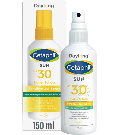 Cetaphil Sun Daylong SPF 30 Sensitive Gel Spray ist ein besonders gut verträglicher Sonnenschutz für allergische, empfindliche und zu Sonnenallergie neigende Haut. Das extra leichte Gel-Spray ist besonders geeignet für schwer erreichbare Körperstellen, behaarte Hautpartien sowie aktive Sportler. Das Sonnenschutz-Spray ist extra leicht, zieht schnell ein und klebt nicht. Photostabile UV-Filter bieten hochwirksamen und sofortigen Sonnenschutz, effektiven Zellschutz1) und beugen sonnenbedingter Hautalterung vor.1) Es enthält weder Emulgatoren noch Fette, die in Kombination mit UVA-Strahlung die häufigsten Auslöser von Mallorca-Akne sind. Das Spray ist schweiß- und extra wasserresistent in Süß- und Salzwasser.