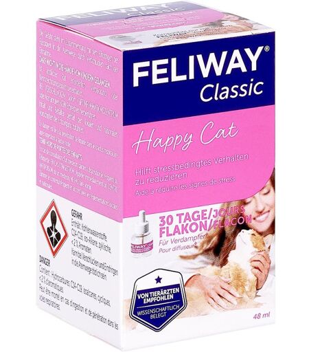 FELIWAY® CLASSIC ist dem natürlichen Wohlfühlpheromon der Katze nachempfunden. Mit dem Verdampfer für die Steckdose führt der Nachfüllflakon zu Wohlbefinden der Samtpfoten auf 50 – 70 m² Wohnfläche. Der Bereich wird zur Wohlfühloase und stressbedingte Verhaltensweisen, wie z.B. Harn- oder Kratzmarkieren, nehmen ab.