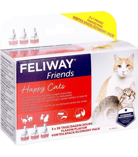 Anwendungsgebiet von Feliway Friends Nachfüllflakon Vorteilspack für KatzenFeliway Friends Nachfüllflakon Vorteilspack für Katzen wird mit dem FELIWAY® FRIENDS Verdampfer angewendet. Für kontinuierliche Entspannung im Mehrkatzenhaushalt den Nachfüllflakon alle 30 Tage erneuern. HAPPY CATS: Für ein harmonisches Zusammenleben der Katzen zuhause. Verwenden Sie den FELIWAY® FRIENDS Nachfüllflakon und sorgen Sie für weitere 30 Tage Harmonie zwischen Ihren Katzen. Als Erinnerungshilfe kann der FELIWAY® -Aufkleber vom Flakon-Etikett in den Kalender geklebt werden. FELIWAY® FRIENDS hilft: die Häufigkeit und Intensität von Spannungen im Mehrkatzenhaushalt zu reduzieren das Zusammenleben zwischen Katzen in einem Haushalt harmonischer zu gestalten Das Wichtigste zum FELIWAY® FRIENDS Nachfüllflakon im Überblick: Hilft Konflikte und Spannungen zwischen zusammenlebenden Katzen zu reduzieren 30-Tage-Flakon Nur zur Anwendung mit dem FELIWAY® Verdampfer Von Tierärzten entwickelt und empfohlen Wissenschaftlich belegt Nicht-medikamentöse Hilfe für mehr Harmonie im Mehrkatzenhaushalt Wie funktioniert FELIWAY® FRIENDS? In der Natur bildet die Katzenmutter ein spezielles Pheromon, um ihren Katzenbabys ein Gefühl von Sicherheit und Geborgenheit zu vermitteln. Dieses Pheromon sorgt für eine harmonische Verbundenheit zwischen Mutter und Katzenkind. FELIWAY® FRIENDS ist eine synthetische Kopie von diesem Pheromon und hat den gleichen besänftigenden Effekt auf Katzen jeden Alters. Wissenschaftlich belegt, hilft FELIWAY® FRIENDS die Spannungen und Konflikte im Mehrkatzenhaushalt zu reduzieren. Einsatzgebiete: -Bei offensichtlichem Konfliktverhalten, wie: Kämpfen Jagen Flüchten Fauchen, Kreischen, Anknurren - Bei subtileren Konfliktverhalten, wie: Weg versperren Anstarren Aus dem Weg gehen V ...