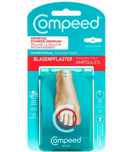 Anwendungsgebiet von Compeed Blasenpflaster an den ZehenCompeed Blasenpflaster an den Zehen für die Zehen lindert effektiv Schmerzen und beschleunigt die Wundheilung. Blasen am Zeh sind sehr schmerzhaft und können mit herkömmlichen Pflastern nicht richtig behandelt werden. Das Compeed Blasenpflaster an den Zehen für die Zehen ist die ideale Lösung: Unser kleinstes Blasenpflaster bietet effektive Polsterung, lindert den Schmerz sofort und verrutscht nicht – ganz gleich, ob es sich um eine Blase am großen oder kleinen Zeh handelt. Durch das besondere Design umschließt das Blasenpflaster den Zeh vollständig und haftet tagelang sicher über der Wunde. Es passt sich perfekt an die Form der betroffenen Stelle an und schützt die Blase am Zeh unauffällig und nachhaltig vor weiterer Reibung. Das Compeed Blasenpflaster an den Zehen für die Zehen weist Wasser, Schmutz und Bakterien ab und beschleunigt durch das Prinzip der feuchten Wundheilung den Heilungsprozess deutlich. Egal ob Laufschuhe, Sandalen oder Pumps – Blasen an den Zehen sind mit diesem Blasenpflaster kein Thema mehr! Wirkstoffe / Inhaltsstoffe / ZutatenProduktinhalt von Compeed Blasenpflaster an den Zehen: 8 Stück Compeed Blasenpflaster an den Zehen GegenanzeigenBei bekannter Überempfindlichkeit gegen einen der Inhaltsstoffe sollte dieses Produkt nicht angewendet werden.DosierungAnwendungsempfehlung von Compeed Blasenpflaster an den Zehen: Säubern und trocknen Sie die betroffene Hautstelle vor der Anwendung. Beachten Sie bitte, dass für die optimale Haftung von Compeed Blasenpflaster an den Zehen die Haut frei von Creme- oder Fettrückständen ist. Ziehen Sie das mit Compeed bedruckte Deckpapier vorsichtig ab und kleben Sie das Pflaster direkt auf die Blase am Fuss. Achten Sie darauf, die Klebeseite des Pflasters nicht zu berühren. Entfernen Sie die weiße Kunststofflasche und streichen Sie die Pflasterränder glatt. Entfernen Sie da ...
