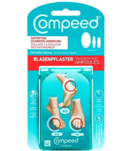 Anwendungsgebiet von Compeed Blasenpflaster MixpackCompeed Blasenpflaster Mixpack vereint die beliebtesten Compeed Blasenplaster in einer praktischen Packung. Das Compeed Blasenpflaster Mixpack ist ideal für jede Haus- und Reiseapotheke geeignet. Egal ob Blasen an den Zehen, Fersen oder kleine Blasen an den Fußaußenseiten: Unser Mixpack enthält die Lösung für die häufigsten Blasenformen. Enthalten sind zwei Blasenpflaster Medium, zwei Blasenpflaster Small und ein Blasenpflaster für die Zehen. Anders als herkömmliche Pflaster setzen die Blasenpflaster von Compeed auf das Prinzip der feuchten Wundheilung mit Hydrokolloid-Technologie. Dadurch beschleunigen sie den Heilungsprozess deutlich und lindern Schmerzen sofort. Die Blasenpflaster schützen die Blase während der Heilung vor zusätzlicher Reibung und Druck. Alle Blasenpflaster im Compeed Blasenpflaster Mixpack weisen Wasser, Schmutz und Bakterien ab und haften im direkten Vergleich zu herkömmlichen Pflastern tagelang sicher. Durch sein praktisches Format passt das Compeed Blasenpflaster Mixpack in jede Handtasche und ist ein unverzichtbarer Begleiter auf Reisen! Wirkungsweise von Compeed Blasenpflaster MixpackCompeed Blasenpflaster Mixpack sorgt für sofortige Schmerz- und Drucklinderung, schützt die Wunde vor Reibung und beschleunigt die Heilung. Compeed Blasenpflaster Mixpack wirkt durch das Prinzip der feuchten Wundheilung. Hydrokolloide halten die Wunde feucht, verhindern die Schorfbildung und schaffen so ein optimales Heilungsmilieu. Compeed Blasenpflaster Mixpack haftet sicher über Tage und unterstützt durch seine wasser-, schmutz- und bakterienabweisenden Eigenschaften die schnellere Regeneration Ihrer Haut. Wirkstoffe / Inhaltsstoffe / ZutatenEine Packung Compeed Blasenpflaster Mixpack enthält: 2 x Blasenpflaster Medium – Für Blasen an der Ferse 2 x Blasenpflaster Small – Für kleinere Blasen oder Blasen an den Fußaußenrändern ...