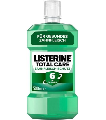 Anwendungsgebiet von Listerine Total Care Zahnfleisch-schutz Mundspül.Zweimal am Tag angewendet, verbessert Listerine Total Care Zahnfleisch-schutz Mundspül. die Mundhygiene – mit ätherischen Ölen, Fluorid und Zinkformel. Die antibakterielle Mundspülung schützt vor Zahnfleischproblemen, erhält das Zahnfleisch gesund und bekämpft wirksam schädliche Bakterien auch dort, wo die Zahnbürste nicht hinkommt: zwischen den Zähnen, am Zahnfleisch und auf der Zunge. Wirkungsweise von Listerine Total Care Zahnfleisch-schutz Mundspül.Listerine Total Care Zahnfleisch-schutz Mundspül. verhindert und reduziert Zahnbelag, eine Hauptursache für Zahnfleischentzündungen, stärkt die Zähne und hilft so, Karies vorzubeugen. Die Mundspülung bietet Rundumschutz für gesundes Zahnfleisch mit 6 in 1 Wirkung und erfrischt den Atem bis zu 24 Stunden.Wirkstoffe / Inhaltsstoffe / ZutatenInhaltstoffe von Listerine Total Care Zahnfleisch-schutz Mundspül.: Aqua, Alcohol, Sorbitol, Poloxamer 407, Benzoic Acid, Sodium Fluoride, Eucalyptol, Zinc Chloride, Sodium Saccharin, Methyl Salicylate, Aroma, Menthol, Sodium Benzoate, CI 47005, CI 42053. Enthält Alkohol. Enthält Natriumfluorid (450 ppm F¯) [PR-0004651]. GegenanzeigenBei bekannter Überempfindlichkeit gegen einen der Inhaltsstoffe sollte dieses Produkt nicht angewendet werden.DosierungAnwendungshinweis von Listerine Total Care Zahnfleisch-schutz Mundspül.: Für den besten Effekt morgens und abends täglich nach dem Zähneputzen spülen. Dazu 20 ml (ca. 4 Teelöffel) in ein Glas geben, ca. 30 Sekunden spülen und anschließend ausspucken.HinweiseFür Kinder ab 12 Jahren geeignet. Nicht schlucken. Bei Verschlucken ärztlichen Rat einholen. Nicht benutzen, wenn Sie gegen einen der Inhaltsstoffe allergisch sind. Bei Reizungen im Mundraum die Verwendung abbrechen und einen Zahnarzt befragen. Außerhalb der Reichweite von Kindern aufbewahren. Listerine Total Care Zahnfleisch-schutz Mundspül. können ...
