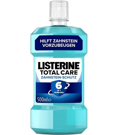 Anwendungsgebiet von Listerine Total Care Zahnstein-schutz MundspülungBei zweimal täglicher Anwendung verbessert Listerine Total Care Zahnstein-schutz Mundspülung die Mundhygiene mit ätherischen Ölen, Fluorid und einer Zinkformel. Antibakterielles Mundwasser bekämpft Bakterien auch dort, wo die Zahnbürste nicht hinkommt: zwischen den Zähnen, auf dem Zahnfleisch und auf der Zunge.Wirkungsweise von Listerine Total Care Zahnstein-schutz MundspülungDie Mundspülung bietet Rundumschutz gegen Zahnsteinbildung mit 6 in 1 Wirkung und erfrischt den Atem bis zu 24 Stunden. Zudem hilft sie das natürliche Zahnweiß zu erhalten.Wirkstoffe / Inhaltsstoffe / ZutatenInhaltstoffe von Listerine Total Care Zahnstein-schutz Mundspülung: Aqua, Alcohol, Sorbitol, Poloxamer 407, Benzoic Acid, Eucalyptol, Zinc Chloride, Methyl Salicylate, Thymol, Sodium Benzoate, Sodium Fluoride, Menthol, Sucralose, Aroma, Sodium Saccharin, CI 42090. Enthält Alkohol. Enthält Natriumfluorid (220 ppm F¯) [PR-0004281]. GegenanzeigenBei bekannter Überempfindlichkeit gegen einen der Inhaltsstoffe sollte dieses Produkt nicht angewendet werden.DosierungAnwendungshinweis von Listerine Total Care Zahnstein-schutz Mundspülung: Für den besten Effekt morgens und abends täglich nach dem Zähneputzen spülen. Dazu 20 ml (ca. 4 Teelöffel) in ein Glas geben, ca. 30 Sekunden spülen und anschließend ausspucken.HinweiseFür Kinder ab 12 Jahren geeignet. Nicht schlucken. Bei Verschlucken ärztlichen Rat einholen. Nicht benutzen, wenn Sie gegen einen der Inhaltsstoffe allergisch sind. Bei Reizungen im Mundraum die Verwendung abbrechen und einen Zahnarzt befragen. Außerhalb der Reichweite von Kindern aufbewahren. Listerine Total Care Zahnstein-schutz Mundspülung können in Ihrer Versandapotheke www.juvalis.de erworben werden. ...