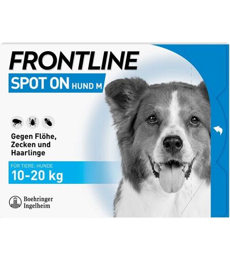Anwendungsgebiet von FRONTLINE® SPOT ON Hund MFRONTLINE® SPOT ON Hund M dient der Behandlung von Floh-, Zecken- und Haarlingsbefall sowie der Behandlung und Kontrolle einer Flohstichallergie bei Hunden. Abtötung von Flöhen, wirkt bis zu 8 Wochen Abtötung von Zecken, wirkt bis zu 4 Wochen Abtötung von Haarlingen, wirkt bis zu 4 Wochen Die hier angebotene Lösung ist zur Anwendung bei Hunden mit einen Körpergewicht von 10-20 kg geeignet. Die Vorteile von FRONTLINE® SPOT ON Hund M gegen Zecken, Flöhe und Haarlinge auf einen Blick: Zuverlässig: Abtötung von über 95% der Flöhe innerhalb von 24 Stunden und über 90% der Zecken innerhalb von 48 Stunden Schützend: Der enthaltene Wirkstoff wirkt bereits sobald der Parasit die Haut berührt, ein Stechen ist für die Wirkung nicht erforderlich Verträglich: Geringe Belastung für Organe und Körper des Hundes, da der Wirkstoff in den Talgdrüsen gespeichert wird Einfach: Frontline® Spot On wird mit einer Pipette einfach auf die Haut aufgetragen Sicher: Darf auch bei tragenden und säugenden Hündinnen angewendet werden FRONTLINE® SPOT ON kann bei Hunden auch zur Behandlung der Flohstichallergie angewendet werden. FRONTLINE® SPOT ON kann bereits bei Hundewelpen ab einem Alter von 12 Wochen und auch bei tragenden oder säugenden Hündinnen angewendet werden. Frontline® ist ein Tierarzneimittel zur Vorbeugung, Behandlung und zuverlässigen Bekämpfung von Zecken, Flöhen und Haarlingen bei Hunden und Katzen. Frontline® kann auch zur Behandlung der Flohstichallergie angewendet werden. Zecken und Flöhe können Hauterkrankungen, wie z.B. Allergien auslösen und Erreger gefährlicher Infektionserkrankungen übertragen. Dabei sind nicht nur unsere Haustiere gefährdet, auch wir als Menschen sind einem Risiko ausgesetzt, wenn Parasiten in unser Zuhause eingeschleppt werden. Frontline® ist das bekannteste Floh- und Z ...