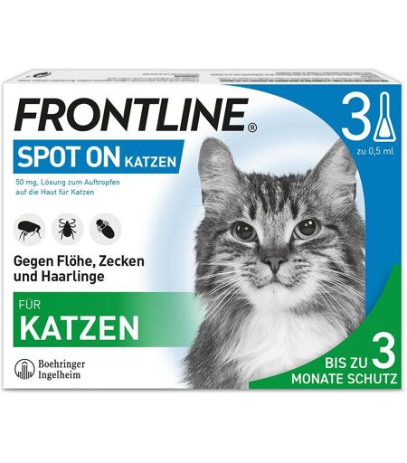 Mit FRONTLINE® SPOT ON schützen Sie Ihre Katze zuverlässig gegen Parasiten wie Zecken, Flöhe und Haarlinge.Ganz egal, ob Haus- oder Freigängerkatze – einfach auf die Haut aufgetragen verteilt sich FRONTLINE® SPOT ON mit dem natürlichen Talgfi lm der Haut und wirkt so wie ein unsichtbarer Schutzmantel. So ist Ihre Samtpfote bei all ihren Abenteuern in Haus, Garten und freier Wildbahn geschützt. Vertrauen Sie der Nr. 1 gegen Zecken und Flöhe bei Hunden und Katzen* – mit bewiesener Wirksamkeit und sehr guter Verträglichkeit für Ihren Vierbeiner.FRONTLINE® SPOT ON kann auch zur Behandlung der Flohstichallergie angewendet werden. Die Anwendung von FRONTLINE® SPOT ONEntnehmen Sie eine Pipette aus der Verpackung. Halten Sie die Pipette aufrecht und knicken Sie die Pipettenspitze an der perforierten Stelle nach unten ab. Das Fell der Katze zwischen den Schulterblättern scheiteln und die Pipette direkt auf die Haut aufsetzen. Dann die Pipette entleeren. Von dieser Stelle aus verteilt sich der Wirkstoff innerhalb von 1 bis 2 Tagen mit dem natürlichen Talgfi lm auf der gesamten Haut. Die Wirkweise von FRONTLINE® SPOT ONNach dem Auftragen verteilt sich das Produkt von der Auftragsstelle aus mit dem natürlichen Talgfi lm der Haut und wirkt so wie ein äußerer, unsichtbarer Schutzmantel gegen Zecken, Flöhe und Haarlinge bei Katzen. Für eine optimale Verteilung sollte Ihre Katze innerhalb von 2 Tagen nach der Anwendung nicht gebadet werden. Parasiten nehmen den Wirkstoff dann bereits bei Kontakt mit Fell und Haut auf und werden so unschädlich gemacht. Die Häufigsten Fragen rund um FRONTLINE® SPOT ON1. Warum sollte ich meine Katze gegen Zecken und Flöhe behandeln?Zecken und Flöhe können Infektions- und Hautkrankheiten auslösen, die nicht nur uns Menschen, sondern auch unseren Tieren gefährlich werden können. Parasitenkrankheiten durch Würmer, wie der Gurkenkernbandwurm, können beispielsweise durch Flöhe übertragen werden. Aber auch Zecken können für unsere Samtpfoten ein Krankheitsrisiko darstellen – Studien haben gezeigt, dass jede dritte Zecke die Auslöser der Borreliose-Krankheit in sich trägt. Daher sollten Tierhalter ihre Vierbeiner vorbeugend mit einem Parasitenschutz behandeln.2. Warum sehe ich nach der Behandlung noch Zecken?FRONTLINE® Spot On macht über 90% der Zecken innerhalb von 48 Stunden unschädlich. Aufgrund des Wirkprinzips ist es jedoch möglich, dass vorübergehend lebende Zecken am Tier sichtbar sind, die das Tier neu befallen haben. Sie werden jedoch abgetötet, sobald ausreichend Wirkstoff durch den Panzer eingedrungen ist und können dann einfach entfernt werden. So kann sichergestellt werden, dass auch für andere Tiere in Haushalt oder Umgebung keine Gefahr der Übertragung von Infektionskrankheiten durch die betroffenen Zecken besteht.3. Warum sehe ich nach der Behandlung noch Flöhe?FRONTLINE® Spot On macht über 95% der Flöhe innerhalb von 24 Stunden unschädlich. Sobald Flöhe auf dem Tier entdeckt werden, haben sich die... ...