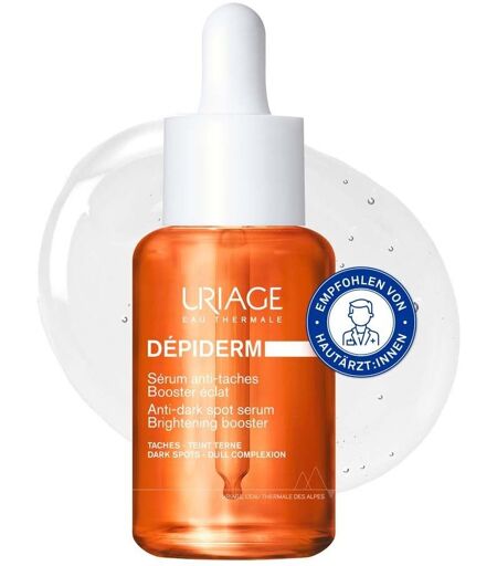 URIAGE DÉPIDERM Aufhellendes Anti-Pigmentflecken Booster Serum Korrigiert Pigmentflecken DÉPIDERM INNOVATION Dieses Serum besteht zu 94 % aus natürlichen Inhaltsstoffen und reduziert sichtbar die Pigmentflecken, gleicht die Haut aus und hellt sie auf. Es bietet einen Ausstrahlungs-Effekt in einer leichten, angenehmen Textur für alle Hauttypen. ANTI-PIGMENTFLECKEN WIRKUNG Dermatologische Wirkstoffe: [Mela Technology + 20 % Vitamin C-Komplex* + Niacinamide]. Dieses Serum kombiniert eine Kernformel, MELA TECHNOLOGY** mit 100 % Inhaltsstoffen natürlichen Ursprungs, mit VITAMIN C und NIACINAMIDE für eine vollständige Korrektur und Vorbeugung gegen Pigmentflecken. *20 % Komplex mit Vitamin C **ERBSEN- UND SACCHAROSE-EXTRAKT + URIAGE-THERMALWASSER + ENOXOLONE HOCHKONZENTRIERT Mit einem 20-% Vitamin-C-Komplex sorgt dieses Serum für einen ebenmäßigen Teint und strahlende Haut. HOHE TOLERANZ Mit seiner parfümfreien, nicht komedogenen und dermatologisch getesteten Formel ist dieses Serum für alle Hauttypen geeignet, auch für empfindliche Haut. 1 BOOST - 3 RESULTATE GLEICHT DEN TEINT AUS: 88%* GLATTERE HAUT: 94%* FÜR MEHR AUSSTRAHLUNG: 81%* REDUZIERT PIGMENTFLECKEN IN 28 TAGEN** *Anwendungstest - 16 Probanden - 28 Tagen: Zufriedenheit in % **Reduziert das Erscheinungsbild - Klinische Bewertung von dem Dermatologen an 32 Probanden nach 28 Tage Anwendung Anwendung: Morgens und abends vor der täglichen Gesichtspflege auf Gesicht, Hals und Dekolleté auftragen. Zusammensetzung: AQUA (WATER, EAU) - PROPANEDIOL - BUTYLENE GLYCOL - DIGLYCERIN - GLYCERIN - 1,2-HEXANEDIOL - ASCORBYL GLUCOSIDE - 3-O-ETHYL ASCORBIC ACID - POLYSORBATE 20 - SODIUM CITRATE - XANTHAN GUM - SODIUM HYDROXIDE - DIPOTASSIUM GLYCYRRHIZATE - NIACINAMIDE - MALTODEXTRIN - CITRIC ACID - SUCROSE DILAURATE - SODIUM COCOYL GLUTAMATE - PISUM SATIVUM EXTRACT (PISUM SATIVUM (PEA) EXTRACT). ...