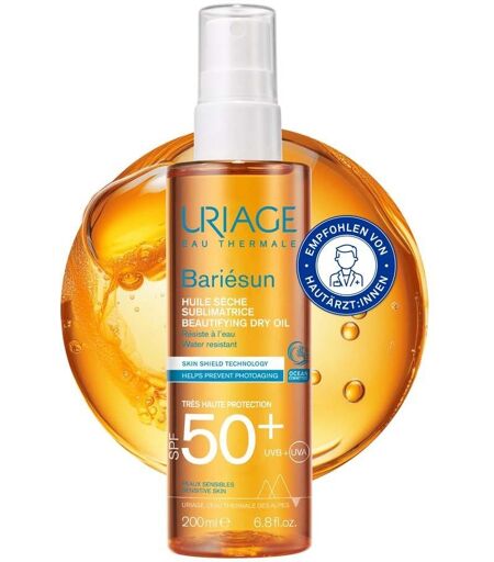 Uriage® Bariésun SPF50+ Pump-Spray Trockenöl Sehr hoher Sonnenschutz für Haut und Haar mit leichter, nicht fettender Textur. Anwendung: Vor dem Aufenthalt in der Sonne eine ausreichende Produktmenge auf die zu schützende Zone auftragen (z. B. 8 Sprühhübe für die Unterschenkel). Regelmäßig wiederholen, besonders nach dem Baden, Schwitzen und Abtrocknen. Übermäßiges Sonnenbaden vermeiden. Babys und Kleinkinder nicht direkter Sonnenstrahlung aussetzen. Inhaltsstoffe: Ascorbyl Tetraisopalmitate, BHT, Bis-Ethylhexyloxyphenol Methoxyphenyl Triazine, Butyl Methoxydibenzoylmethane, Dicaprylyl Carbonate, Diethylamino Hydroxybenzoyl Hexyl Benzoate, Ethylhexyl Methoxycinnamate, Ethylhexyl Salicylate, Ethylhexyl Triazone, Hydrogenated Polydecene, Isohexadecane, Parfum (Fragrance), Tocopherol, Tocopheryl Acetate. Hersteller: Laboratoires Dermatologiques Uriage 40-52 boulevard du Parc 92200 Neuilly-sur-Seine, Frankreich ...