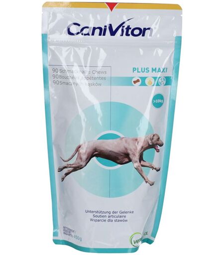 Ergänzungsfuttermittel für mittelgroße und große Hunde Caniviton Plus Maxi Caniviton Plus Maxi unterstützt die Gelenke von mittelgroßen und großen Hunden mit einer speziellen Kombination aus Chondroitinsulfat, Glucosamin und Omega-3-Fettsäuren. Die schmackhaften Chews sind leicht zu verabreichen und eignen sich für die tägliche Gabe. Zusammensetzung: Bierhefe, Glycerin, Cellulosepulver, Glucosamin HCl (11 %), Chondroitinsulfat (11 %), Linsenmehl (Quelle pflanzlicher Eiweiße), hydrolysiertes Protein (Geflügel), Palm-Schmierseife, Macrogol. Analytische Bestandteile und Gehalte: Rohprotein: 13 %, Rohfett: 3 %, Rohfaser: 1,5 %, Rohasche: 2 %. Fütterungsempfehlung: Mittelgroße Hunde (10-30 kg): 2 Chews täglich Große Hunde (>30 kg): 3 Chews täglich Zusatzstoffe je kg: Omega-3-Fettsäuren: 2,5 %, Feuchtigkeit: 14 %. Verpackungsgröße: 450 g (90 Chews) Hersteller: Vetoquinol S.A., Magny-Vernois, 70200 Lure, Frankreich ...