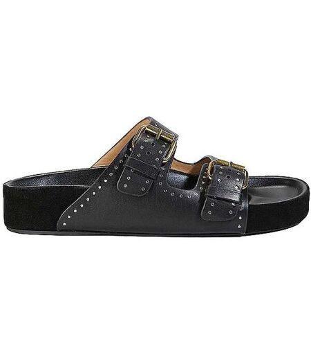 Flache Damen Sandalen aus beschlagenem Leder Offen mit Riemen Schnallen aus Metall Dicke Laufsohle Goldfarbene Metallarbeit Farbbezeichnung: Black Material: 100% Kalbs-Veloursleder ...