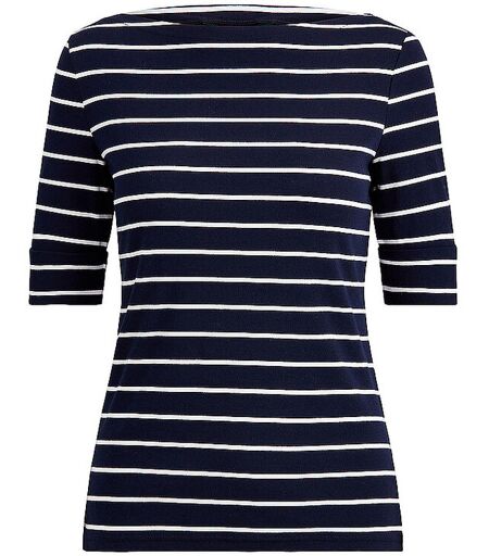 Damen T-Shirt aus Baumwoll-Stretch U-Boot-Ausschnitt Halbarm Ringelmuster Schmale Passform Farbbezeichnung: Lauren Navy / White Material: 94% Baumwolle, 6% Elasthan ...