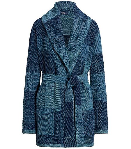 Damen Strickjacke aus Baumwolle Schalkragen Langarm Offen zu tragen Tonaler Bindegürtel Aufgesetzte Eingrifftaschen Strickmuster Color Blocking Gerade geschnitten Farbbezeichnung: Indigo Multi Material: 100% Baumwolle ...