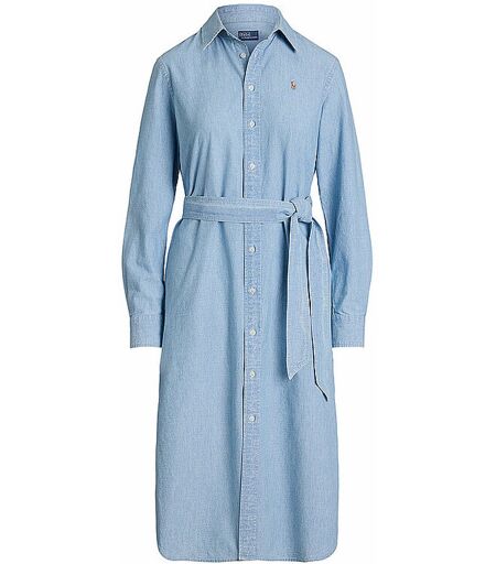 Damen Midikleid aus reiner Baumwolle Hemdblusenkragen Schließt mit Knopfleiste Bindegürtel in der Taille Langarm mit Manschetten Logo-Stickerei auf der Brust Seitliche Eingrifftaschen Unterknielänge Unifarben Farbbezeichnung: Chambray Material: 100% Baumwolle ...