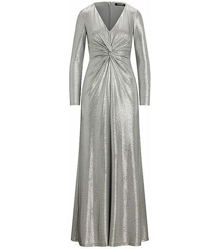 Damen Abendkleid aus schwerem Jersey mit Metallic-Coating V-Ausschnitt Verdeckter Reißverschluss hinten in der Mitte mit einem Haken-und-Ösen-Verschluss Langärmlig Gedrehtes Detail vorne an der Taillenmitte Durchgehendes Futter Farbbezeichnung: Silver Länge: ca. 150cm Außenmaterial und Futter: 95 % Polyester, 5 % Elasthan ...