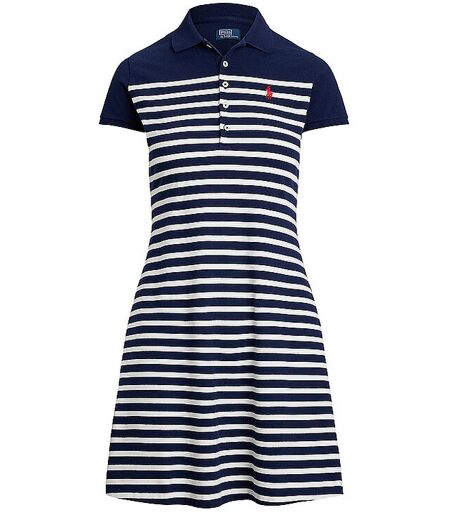 Damen Midikleid aus reiner Baumwolle Polokragen mit kurzer Knopfleiste Kurzarm mit schmalem Bündchen Logo-Stickerei auf der Brust Ringelmuster Ausgestellte Passform Farbbezeichnung: Cruise Navy / White Material: 100% Baumwolle ...