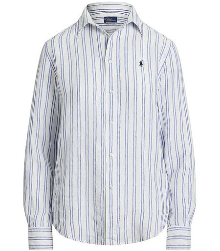 Klassische Damen Bluse aus reinem Leinen Hemdblusenkragen Schließt mit Knopfleiste Langarm mit geknöpften Manschetten Logo-Stickerei auf der Brust Streifenmuster Gerade Passform Farbbezeichnung: White Blue Material: 100% Leinen ...