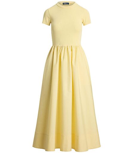 Damen Midikleid aus reiner Baumwolle Rundhalsausschnitt Kurzarm Rockteil mit seitlichen Eingrifftaschen Schmale Passform Midilänge Unifarben Länge: Ca: 135 cm Farbbezeichnung: Yellow Material: 100% Baumwolle ...