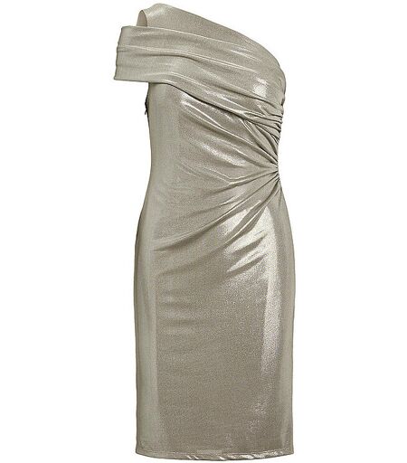 Damen Cocktailkleid aus metallischem Jersey One-Shoulder-Silhouette mit Doppelträger am rechten Schulter Verdeckter Reißverschluss an der rechten Seitennaht mit Haken- und Ösenverschluss Raffung an der linken Taille Figurbetonter Sheath-Schnitt Fällt knapp oberhalb des Knies Vollständig gefüttert Farbbezeichnung: Bright Nickel / Silver Foil Material: 89% Polyester, 11% Elasthan ...