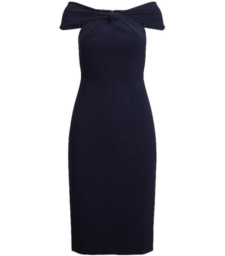 Damen Abendkleid aus Stretch Off-Shoulder Ausschnitt mit Drapierung Schmal geschnitten Unifarben Midilänge Farbbezeichnung: LIghthouse Navy Material: 91% Polyester (recycelt), 9% Elastan ...