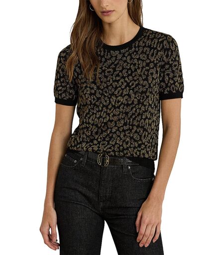Damen Kurzarm Pullover aus Feinstrick Mit Lurex-Einwebung Rundhalsausschnitt Kurzarm Allover-Leo Pirnt Schmal geschnitten Farbbezeichnung: Black Relic Gold Metallic Material: 70% Viskose 18% Polyester recycelt 10% Metallische Faser 2% andere Fasern ...