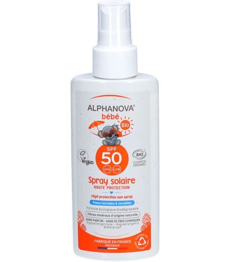 ALPHANOVA® bébé Sonnenspray für Babys LSF 50 Um ihr Baby vor der Sonne zu schützen Diese zertifizierte Bio-Sonnencreme für Babys ist wasserfest, ohne chemische Filter, ohne Parabene, ohne chemische Konservierungsstoffe und umweltfreundlich. Darüber hinaus wird diese Bio-Sonnencreme für Babys ohne Alkohol, Duftstoffe und Phenoxyethanol hergestellt. Die ideale Wahl für die empfindliche Haut von Babys. Die ALPHANOVA BIO ® Baby Sonnencreme ist hypoallergen und dermatologisch getestet. Anwendung: Denken Sie daran, die Bio-Baby-Sonnencreme großzügig und gleichmäßig aufzutragen. Nach dem Schwimmen oder nach dem Abtrocknen erneut auftragen. Vermeiden Sie es, Ihre Kinder der Sonne auszusetzen, insbesondere zwischen 11 und 15 Uhr. Denken Sie daran, sie mit einem T-Shirt, einem Hut und einer Sonnenbrille zu bedecken. Ingredients: Dicaprylyl Carbonate, Aqua, Caprylic/Capric Triglyceride, Titanium Dioxide [nano]**, Glycerin, Coconut Alkanes, Simmondsia Chinensis Seed Oil*, Polyglyceryl-3 Diisostearate, Polyglyceryl-2 Dipolyhydroxystearate, Polyhydroxystearic Acid, Calophyllum Inophyllum Seed Oil*, Magnesium Sulfate, Sodium Chloride, Stearic Acid, Aloe Barbadensis Leaf Juice Powder*, Aluminum Hydroxide, Sodium Levulinate, Coco Caprylate/Caprate, Glyceryl Caprylate, Alumina, Sodium Anisate, Citric Acid, Tocopherol *Zutaten aus biologischem Anbau 98,59% der Gesamtmenge sind natürlichen Ursprungs. 21% der gesamten Inhaltsstoffe stammen aus biologischem Anbau. COSMOS ORGANIC, zertifiziert von ECOCERT Greenlife nach dem COSMOS-Standard. ** Alphanova hat Studien von einem unabhängigen Analyselabor durchführen lassen, das bescheinigt, dass unsere mineralischen Filter UV-Strahlen reflektieren und auf der Hautoberfläche verbleiben, ohne in die Haut einzudringen. Diese Studien wurden sowohl an unseren Endprodukten als auch an den Inhaltsstoffen, aus denen sie bestehen, durchgeführt. ...