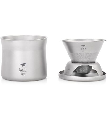 Der Keith Titanium Mini Coffee & Tea Maker ist eine Offenbarung für alle Kaffee- und Teefreunde, die schweres Equipment und lange Wartezeiten satt sind. Während bei Espressokannen oder Perkolatoren zuerst die Einzelteilt zusammengesetzt werden müssen, ist das Titan Set durch sein simples aber geniales Design sofort einsatzbereit. Alles, was du brauchst, ist kochendes Wasser. Grundlage ist der robuste Titanbecher, aus dem du nach vollendetem Brühvorgang direkt trinken kannst. Wenn du frischen Tee aufgießen willst, setzt du einfach den kegelförmigen Filtereinsatz in den Becher, füllst ihn mit Teeblättern und gießt ihn mit heißem Wasser auf – fertig! Für frisch gebrühten Kaffee ist im Keith Titanium Mini Coffee & Tea Maker ein zusätzlicher kleiner Aufsatz enthalten, der den Filter etwas oberhalb des Bechers platziert. Auch hier wird lediglich das Kaffeepulver in den Filter gegeben und anschließend das heiße Wasser aufgegossen. Durch den Filter sickert der frische Kaffee in den Becher, von wo aus er sofort deine Lebensgeister wiedererwecken kann. Ebenfalls im Keith Titanium Mini Coffee & Tea Maker enthalten ist ein kleiner Deckel, der das gesamte Set kompakt verschließt. So hast du am Ende nur das Packmaß des Titanbechers im Rucksack und kannst ohne großen Aufwand überall und jederzeit deine frisch gebrühten Heißgetränke genießen! ...